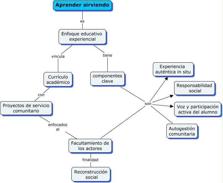 Este Cmap, tiene información relacionada con: Capítulo 4.1, Enfoque educativo experiencial vincula Currículo académico, Facultamiento de los actores finalidad Reconstrucción social, Aprender sirviendo es Enfoque educativo experiencial, componentes clave son Responsabilidad social, componentes clave son Autogestión comunitaria, componentes clave son Experiencia auténtica in situ, componentes clave son Voz y participación activa del alumno, Proyectos de servicio comunitario enfocados al ????, componentes clave son Facultamiento de los actores, Currículo académico con Proyectos de servicio comunitario, Enfoque educativo experiencial tiene componentes clave