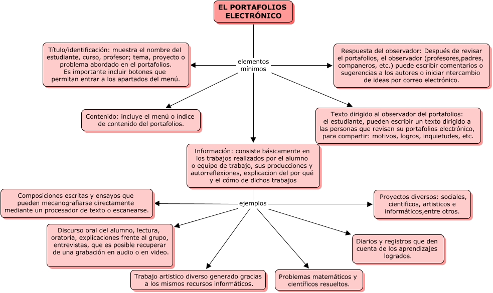 Este Cmap, tiene información relacionada con: Capítulo 5.6, EL PORTAFOLIOS ELECTRÓNICO elementos mínimos Información: consiste básicamente en los trabajos realizados por el alumno o equipo de trabajo, sus producciones y autorreflexiones, explicacion del por qué y el cómo de dichos trabajos, Información: consiste básicamente en los trabajos realizados por el alumno o equipo de trabajo, sus producciones y autorreflexiones, explicacion del por qué y el cómo de dichos trabajos ejemplos Trabajo artistico diverso generado gracias a los mismos recursos informáticos., Información: consiste básicamente en los trabajos realizados por el alumno o equipo de trabajo, sus producciones y autorreflexiones, explicacion del por qué y el cómo de dichos trabajos ejemplos Problemas matemáticos y científicos resueltos., Información: consiste básicamente en los trabajos realizados por el alumno o equipo de trabajo, sus producciones y autorreflexiones, explicacion del por qué y el cómo de dichos trabajos ejemplos Discurso oral del alumno, lectura, oratoria, explicaciones frente al grupo, entrevistas, que es posible recuperar de una grabación en audio o en video., EL PORTAFOLIOS ELECTRÓNICO elementos mínimos Texto dirigido al observador del portafolios: el estudiante, pueden escribir un texto dirigido a las personas que revisan su portafolios electrónico, para compartir: motivos, logros, inquietudes, etc., Información: consiste básicamente en los trabajos realizados por el alumno o equipo de trabajo, sus producciones y autorreflexiones, explicacion del por qué y el cómo de dichos trabajos ejemplos Composiciones escritas y ensayos que pueden mecanografiarse directamente mediante un procesador de texto o escanearse., EL PORTAFOLIOS ELECTRÓNICO elementos mínimos Título/identificación: muestra el nombre del estudiante, curso, profesor; tema, proyecto o problema abordado en el portafolios. Es importante incluir botones que permitan entrar a los apartados del menú., Información: consiste básicamente en los trabajos realizados por el alumno o equipo de trabajo, sus producciones y autorreflexiones, explicacion del por qué y el cómo de dichos trabajos ejemplos Proyectos diversos: sociales, cientificos, artisticos e informáticos,entre otros., Información: consiste básicamente en los trabajos realizados por el alumno o equipo de trabajo, sus producciones y autorreflexiones, explicacion del por qué y el cómo de dichos trabajos ejemplos Diarios y registros que den cuenta de los aprendizajes logrados., EL PORTAFOLIOS ELECTRÓNICO elementos mínimos Respuesta del observador: Después de revisar el portafolios, el observador (profesores,padres, companeros, etc.) puede escribir comentarios o sugerencias a los autores o iniciar ntercambio de ideas por correo electrónico., EL PORTAFOLIOS ELECTRÓNICO elementos mínimos Contenido: incluye el menú o índice de contenido del portafolios.