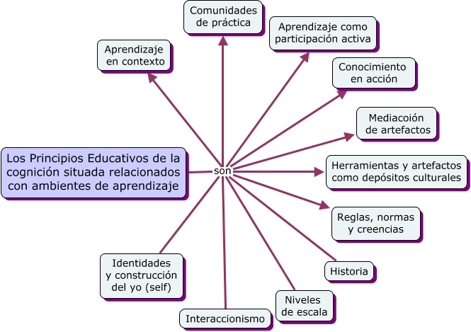 Este Cmap, tiene información relacionada con: Capítulo 1.4, Los Principios Educativos de la cognición situada relacionados con ambientes de aprendizaje son Historia, Los Principios Educativos de la cognición situada relacionados con ambientes de aprendizaje son Identidades y construcción del yo (self), Los Principios Educativos de la cognición situada relacionados con ambientes de aprendizaje son Niveles de escala, Los Principios Educativos de la cognición situada relacionados con ambientes de aprendizaje son Herramientas y artefactos como depósitos culturales, Los Principios Educativos de la cognición situada relacionados con ambientes de aprendizaje son Aprendizaje en contexto, Los Principios Educativos de la cognición situada relacionados con ambientes de aprendizaje son Interaccionismo, Los Principios Educativos de la cognición situada relacionados con ambientes de aprendizaje son Mediacoión de artefactos, Los Principios Educativos de la cognición situada relacionados con ambientes de aprendizaje son Conocimiento en acción, Los Principios Educativos de la cognición situada relacionados con ambientes de aprendizaje son Reglas, normas y creencias, Los Principios Educativos de la cognición situada relacionados con ambientes de aprendizaje son Comunidades de práctica, Los Principios Educativos de la cognición situada relacionados con ambientes de aprendizaje son Aprendizaje como participación activa