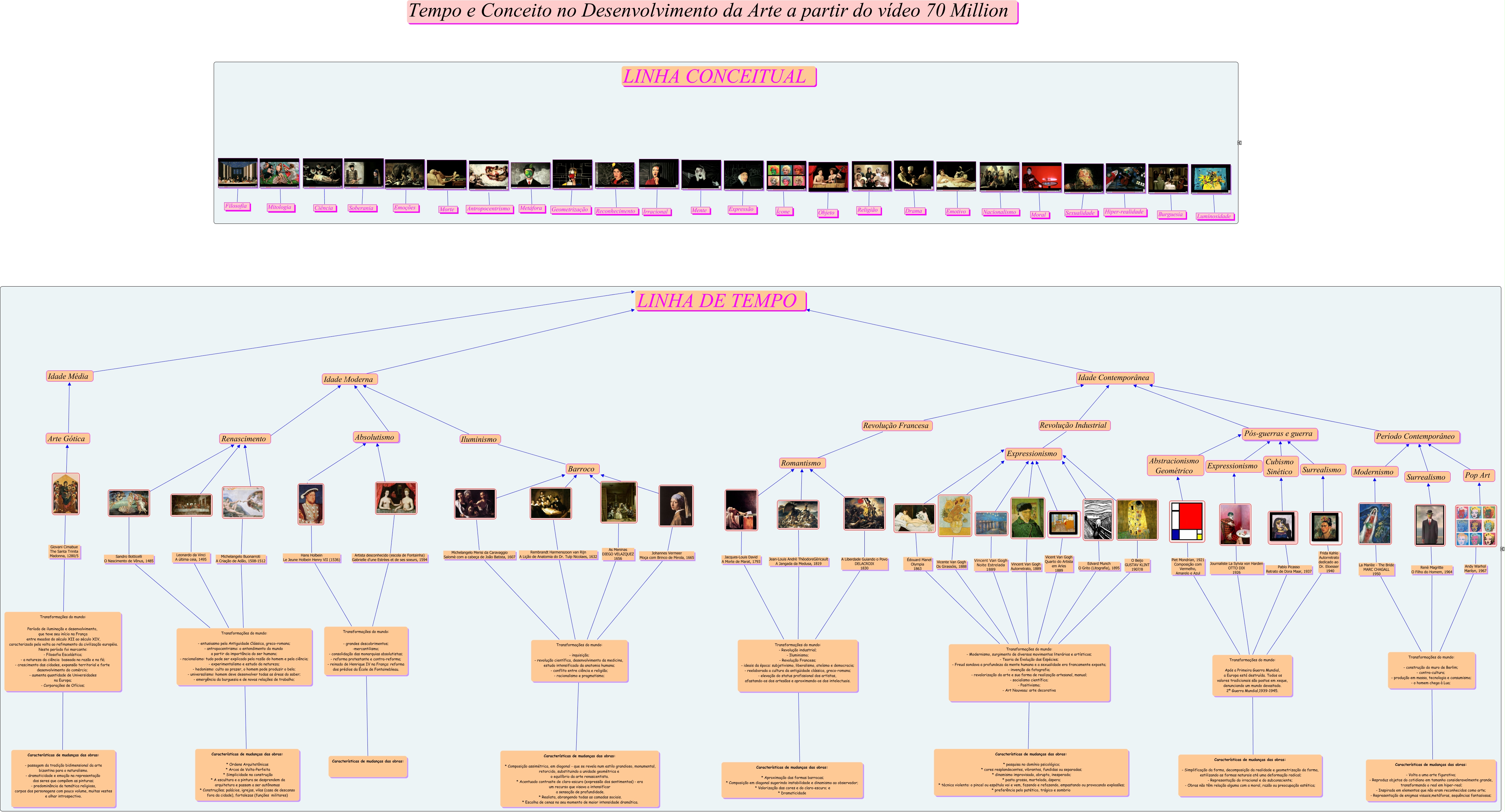 Esse mapa conceitual, produzido no IHMC CmapTools, tem a informação relacionada a: Tempo e Conceito no Desenvolvimento da Arte, a partir do vídeo 70 millon, Renascimento Idade Moderna, Barroco, Sandro Botticelli O Nascimento de Vênus, 1485 Transformações do mundo: - entusiasmo pela Antiguidade Clássica, greco-romana; - antropocentrismo: o entendimento do mundo a partir da importância do ser humano; - racionalismo: tudo pode ser explicado pela razão do homem e pela ciência; - experimentalismo e estudo da natureza; - hedonismo: culto ao prazer, o homem pode produzir o belo; - universalismo: homem deve desenvolver todas as áreas do saber; - emergência da burguesia e de novas relações de trabalho;, Surrealismo, Revolução Industrial Idade Contemporânea, Barroco, La Mariée - The Bride MARC CHAGALL 1950 Transformações do mundo: - construção do muro de Berlim; - contra-cultura; - produção em massa, tecnologia e consumismo; - o homem chega à Lua;, Revolução Francesa Idade Contemporânea, Vincent Van Gogh Autorretrato, 1889 Transformações do mundo: - Modernismo, surgimento de diversos movimentos literários e artísticos; - Teoria de Evolução das Espécies; - Freud sondava a profundeza da mente humana e a sexualidade era francamente exposta; - invenção da fotografia; - revalorização da arte e sua forma de realização artesanal, manual; - socialismo científico; - Positivismo; - Art Nouveau: arte decorativa, Renascimento, Idade Moderna LINHA DE TEMPO, Renascimento, Idade Média LINHA DE TEMPO, Pós-guerras e guerra Idade Contemporânea, Emoções, Ciência, O Beijo GUSTAV KLINT 1907/8 Transformações do mundo: - Modernismo, surgimento de diversos movimentos literários e artísticos; - Teoria de Evolução das Espécies; - Freud sondava a profundeza da mente humana e a sexualidade era francamente exposta; - invenção da fotografia; - revalorização da arte e sua forma de realização artesanal, manual; - socialismo científico; - Positivismo; - Art Nouveau: arte decorativa, Expressionismo, Romantismo, Antropocentrismo