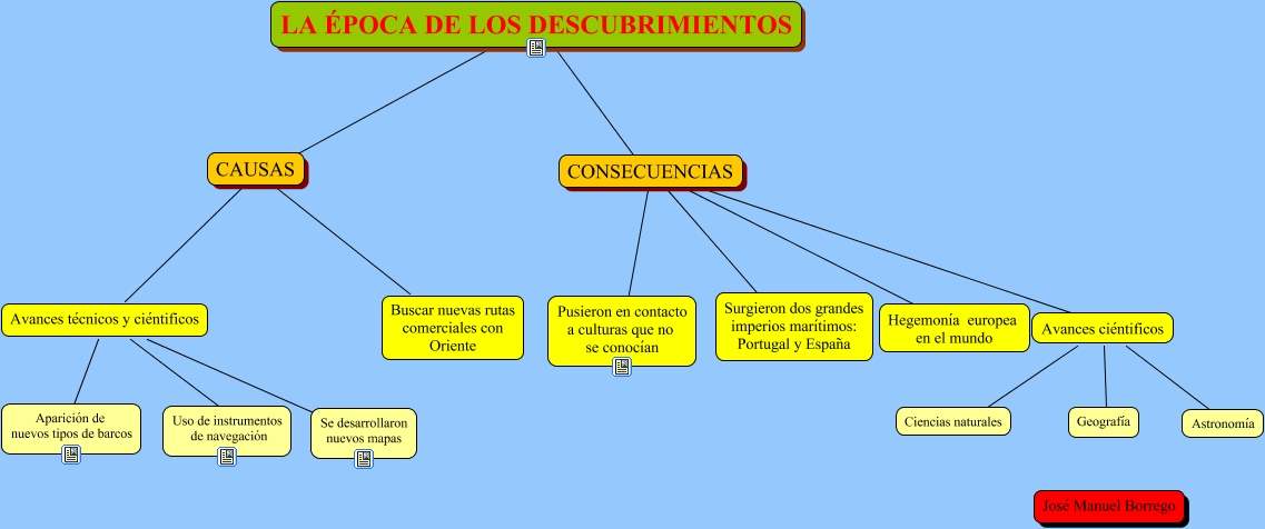 Este Cmap, tiene información relacionada con: La época de los descubrimientos, CONSECUENCIAS ???? Hegemonía europea en el mundo, Avances técnicos y ciéntificos ???? Aparición de nuevos tipos de barcos, CONSECUENCIAS ???? Surgieron dos grandes imperios marítimos: Portugal y España, CONSECUENCIAS ???? Pusieron en contacto a culturas que no se conocían, Avances ciéntificos ???? Astronomía, Avances ciéntificos ???? Ciencias naturales, LA ÉPOCA DE LOS DESCUBRIMIENTOS ???? CAUSAS, LA ÉPOCA DE LOS DESCUBRIMIENTOS ???? CONSECUENCIAS, Avances ciéntificos ???? Geografía, CONSECUENCIAS ???? Avances ciéntificos, CAUSAS Fueron Buscar nuevas rutas comerciales con Oriente, Avances técnicos y ciéntificos ???? Se desarrollaron nuevos mapas, CAUSAS Fueron Avances técnicos y ciéntificos, Avances técnicos y ciéntificos ???? Uso de instrumentos de navegación
