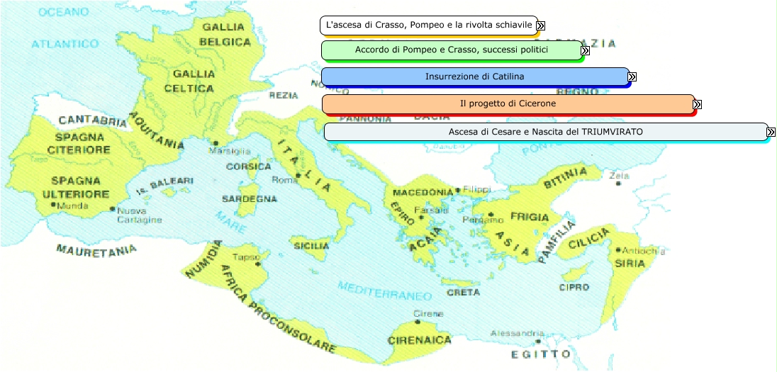 Questa Cmap, creata con IHMC CmapTools, contiene informazioni relative a: Dall'ascesa di Pompeo al primo Triumvirato (Sonzogni), Sergio Catilina "fama" di esecutore delle stragi organizzate da Silla, Tullio Cicerone era un homo novus, Sbarca a Brindisi, congeda l'esercito e si manifesta in senato progetti politici, un homo novus ovvero non vantava nella sua famiglia membri che avessero coperto magistrature, progetti politici ricerca appoggio di Gaio Giulio Cesare, l'assoggetteranno ad umiliazioni ritardo di ratifica provvedimenti per l'oriente, ordinamenti oligarchici rupubblicani sono stati fortemente perfezionati, campagne militari in Cilicia, nel 67a.C., la legge di Publio Clodio a favore dell'appello al pubblico (59a.C) lo esilierà da Roma, Siria, Armenia, Giudea coalizzando Stati vassalli, ricerca appoggio di Gaio Giulio Cesare che guadagna ampi consensi dai populares, Crasso essi sono legati da antica rivalità, volesse ispirarsi a Silla diffondendo potere assoluto tuttavia egli Sbarca a Brindisi, congeda l'esercito e si manifesta in senato, essere un usurpatore della repubblica e che volesse ispirarsi a Silla diffondendo potere assoluto, insorge contro l'esercito inviato dal senato a Pistoia, Ascende, in questo periodo di tumulto dell'impero ???? Pompeo Magno, concordia ordinum cioé l'accordo di tutti i ceti, non si distingue per le abilità di generale ma per il suo bagaglio culturale, Pompeo Magno al quale è affidata spedizione contro Quinto Sertorio (76a.C.), Tullio Cicerone che non si distingue per le abilità di generale