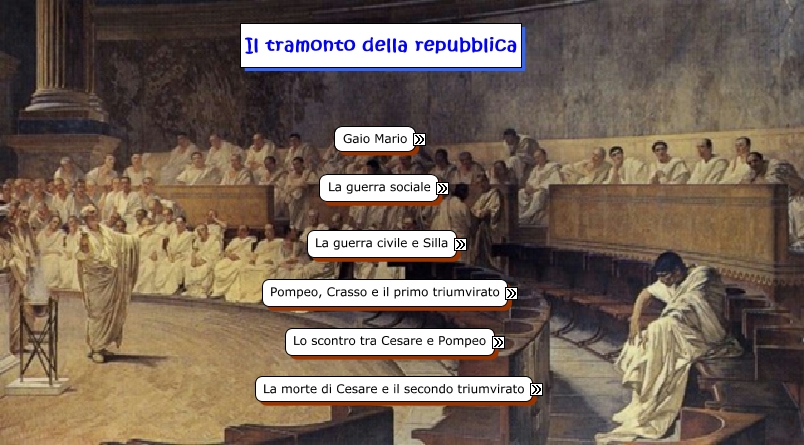 Questa Cmap, creata con IHMC CmapTools, contiene informazioni relative a: Il tramonto della repubblica (Elena Baroni), triumvirato composto da Crasso, Aquae Sextiae nel 102 a.C., Pompeo Magno intorno al 60 a.C., sconfisse i pompeiani nelle battaglie di Munda, i Romani vennero a loro volta sconfitti e successivamente sconfissero di nuovo Cimbri, Marco Licino Crasso dovette sopprimere la rivolta schiavile in Italia, Cesare sarebbe dovuto tornare a Roma come privato cittadino ma ordinò al suo esercito di posizionarsi lungo il Rubicone, Gaio Giulio Cesare Ottaviano (figlio adottivo di Cesare), i Romani vennero a loro volta sconfitti e successivamente sconfissero di nuovo Teutoni, Italici erano scontenti perché da tempo fornivano un contributo nell'esercito, le ostilità tra Antonio e Ottaviano causarono la battaglia di Azio, campagna contro i Cimbri e i Teutoni che si concluse con una aio, ucciso a causa di una congiura da parte di Bruto e Cassio, Marco Tullio Cicerone che voleva un accordo di tutti i ceti, Campi Raudii nel 100 a.C., nella battaglia di Modena, Pompeo dovette ritirarsi in Egitto dove venne ucciso da Tolomeo, Modena al seguito della quale ci fu il secondo triumvirato, 60 a.C. era alle prese con la pacificazione dell'oriente, Quinto Sertorio che però venne avvelenato da un suo ufficiale