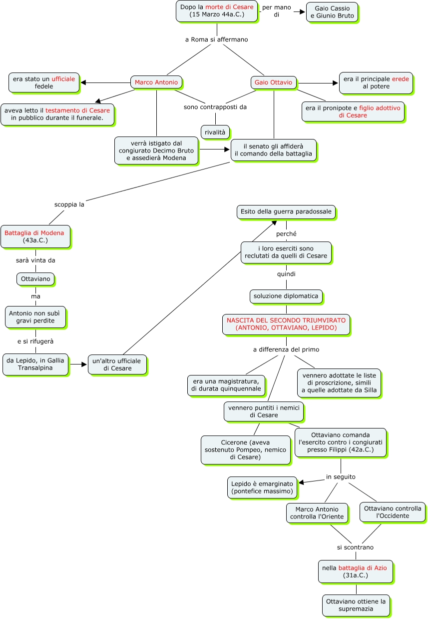 Questa Cmap, creata con IHMC CmapTools, contiene informazioni relative a: Il Secondo Triumvirato e l'Ascesa di Ottaviano (Sonzogni), soluzione diplomatica ???? NASCITA DEL SECONDO TRIUMVIRATO (ANTONIO, OTTAVIANO, LEPIDO), Gaio Ottavio sono contrapposti da rivalità, Ottaviano comanda l'esercito contro i congiurati presso Filippi (42a.C.) in seguito Marco Antonio controlla l'Oriente, Dopo la morte di Cesare (15 Marzo 44a.C.) a Roma si affermano Gaio Ottavio, Ottaviano controlla l'Occidente si scontrano nella battaglia di Azio (31a.C.), verrà istigato dal congiurato Decimo Bruto e assedierà Modena ???? il senato gli affiderà il comando della battaglia, Ottaviano comanda l'esercito contro i congiurati presso Filippi (42a.C.) in seguito Lepido è emarginato (pontefice massimo), Battaglia di Modena (43a.C.) sarà vinta da Ottaviano, Ottaviano comanda l'esercito contro i congiurati presso Filippi (42a.C.) in seguito Ottaviano controlla l'Occidente, Antonio non subì gravi perdite e si rifugerà da Lepido, in Gallia Transalpina, Gaio Ottavio ???? il senato gli affiderà il comando della battaglia, Esito della guerra paradossale perché i loro eserciti sono reclutati da quelli di Cesare, Marco Antonio ???? aveva letto il testamento di Cesare in pubblico durante il funerale., Dopo la morte di Cesare (15 Marzo 44a.C.) a Roma si affermano Marco Antonio, nella battaglia di Azio (31a.C.) ???? Ottaviano ottiene la supremazia, Marco Antonio sono contrapposti da rivalità, NASCITA DEL SECONDO TRIUMVIRATO (ANTONIO, OTTAVIANO, LEPIDO) a differenza del primo vennero adottate le liste di proscrizione, simili a quelle adottate da Silla, vennero puntiti i nemici di Cesare ???? Ottaviano comanda l'esercito contro i congiurati presso Filippi (42a.C.), i loro eserciti sono reclutati da quelli di Cesare quindi soluzione diplomatica, Marco Antonio ???? verrà istigato dal congiurato Decimo Bruto e assedierà Modena