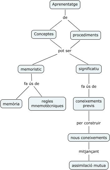 Este Cmap, tiene información relacionada con: aprenentatge, Aprenentatge de Conceptes, Aprenentatge de procediments, coneixements previs per construir nous coneixements, Conceptes pot ser memoristic, procediments pot ser memoristic, memoristic fa ús de regles mnemotècniques, Conceptes pot ser significatiu, memoristic fa ús de memòria, nous coneixements mitjançant assimilació mutua, procediments pot ser significatiu, significatiu fa ús de coneixements previs