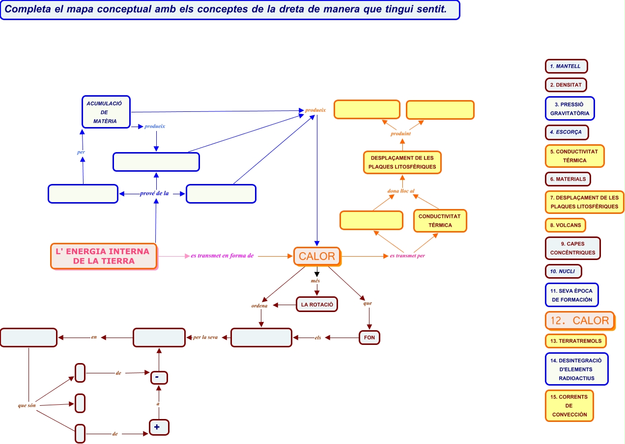 Este Cmap, tiene información relacionada con: Energia interna exa complert, L' ENERGIA INTERNA DE LA TIERRA prové de la, CALOR més LA ROTACIÓ, que són, DESPLAÇAMENT DE LES PLAQUES LITOSFÈRIQUES produint, dona lloc al DESPLAÇAMENT DE LES PLAQUES LITOSFÈRIQUES, L' ENERGIA INTERNA DE LA TIERRA prové de la, FON els, ACUMULACIÓ DE MATÈRIA produeix, CALOR es transmet per CONDUCTIVITAT TÉRMICA, que són, de <math xmlns="http://www.w3.org/1998/Math/MathML"> <mtext> - </mtext> </math>, per ACUMULACIÓ DE MATÈRIA, que són, CONDUCTIVITAT TÉRMICA dona lloc al DESPLAÇAMENT DE LES PLAQUES LITOSFÈRIQUES, <math xmlns="http://www.w3.org/1998/Math/MathML"> <mtext> + </mtext> </math> a <math xmlns="http://www.w3.org/1998/Math/MathML"> <mtext> - </mtext> </math>, per la seva, de <math xmlns="http://www.w3.org/1998/Math/MathML"> <mtext> + </mtext> </math>, CALOR que FON, ACUMULACIÓ DE MATÈRIA produeix CALOR, <math xmlns="http://www.w3.org/1998/Math/MathML"> <mtext> - </mtext> </math> ????