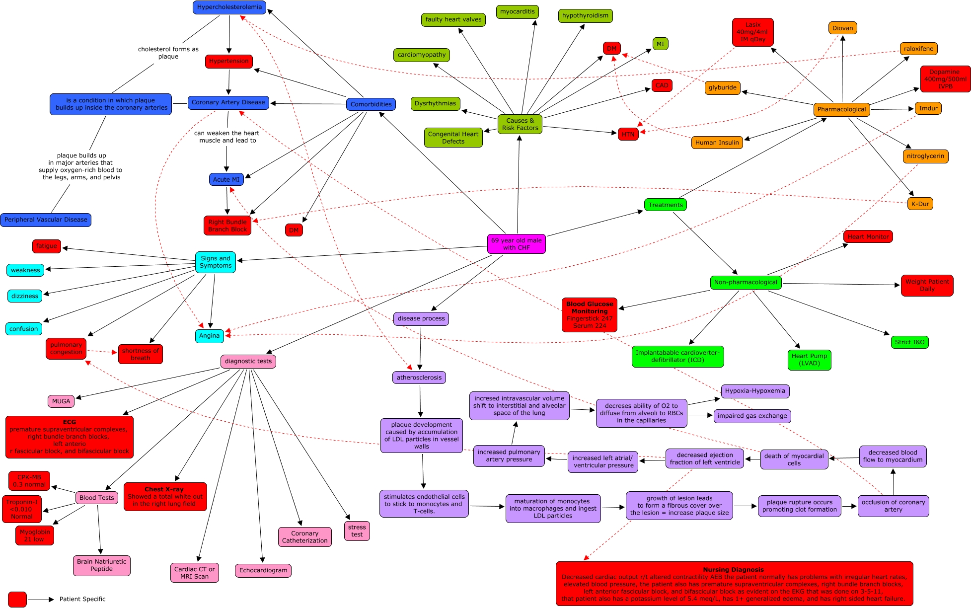 This Concept Map, created with IHMC CmapTools, has information related to: CHF, death of myocardial cells decreased ejection fraction of left ventricle, Hypercholesterolemia Hypertension, Causes & Risk Factors CAD, Pharmacological K-Dur, is a condition in which plaque builds up inside the coronary arteries plaque builds up in major arteries that supply oxygen-rich blood to the legs, arms, and pelvis Peripheral Vascular Disease, Lasix 40mg/4ml IM qDay HTN, Signs and Symptoms dizziness, disease process atherosclerosis, Coronary Artery Disease Angina, Hypercholesterolemia atherosclerosis, diagnostic tests Cardiac CT or MRI Scan, Non-pharmacological Heart Monitor, decreses ability of O2 to diffuse from alveoli to RBCs in the capillaries Hypoxia-Hypoxemia, Treatments Pharmacological, diagnostic tests Coronary Catheterization, diagnostic tests stress test, Signs and Symptoms fatigue, Signs and Symptoms shortness of breath, 69 year old male with CHF Comorbidities, Non-pharmacological Weight Patient Daily