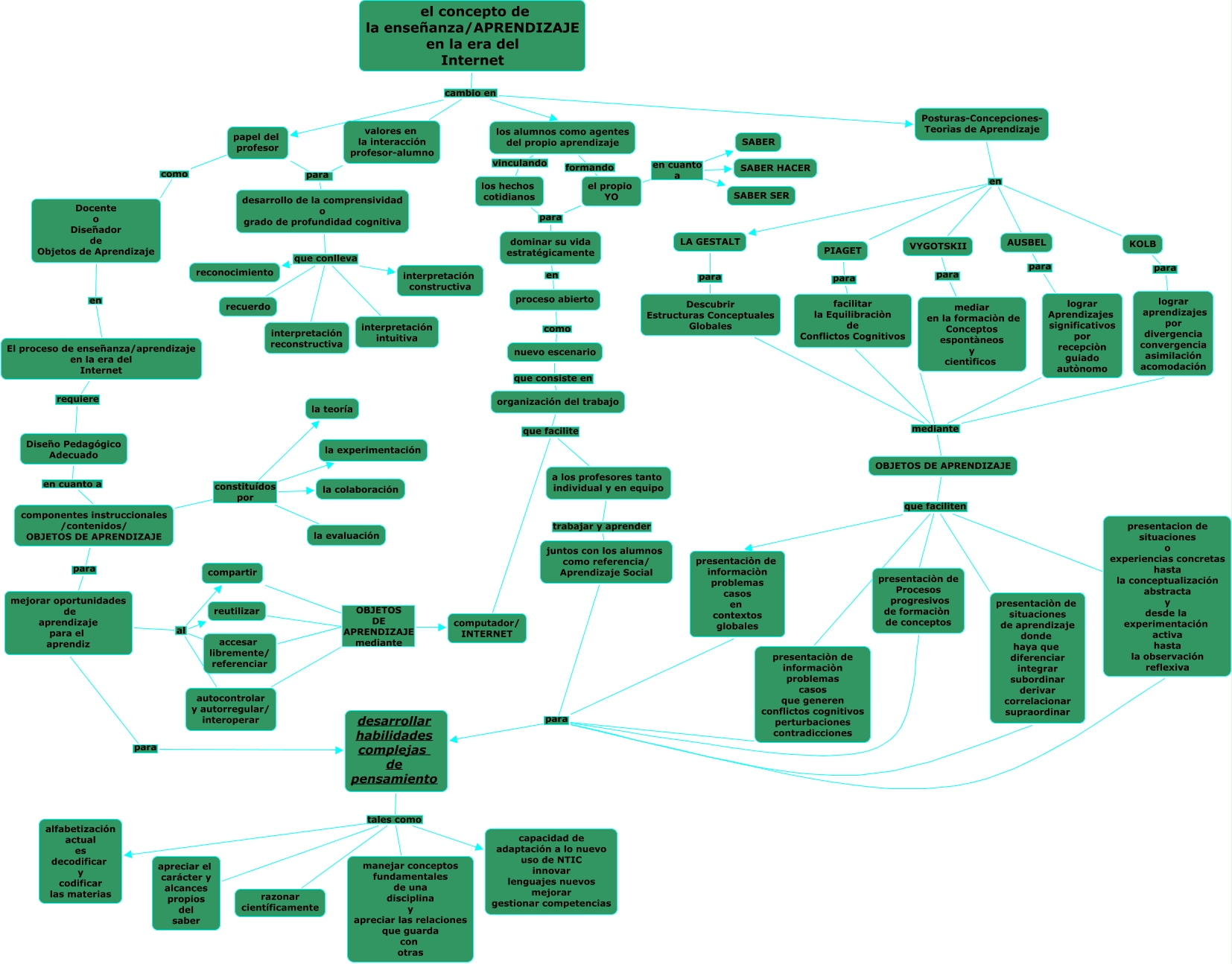 Este Cmap, tiene información relacionada con: OBJETOS DE APRENDIZAJE, el concepto de la enseñanza/APRENDIZAJE en la era del Internet cambio en papel del profesor, componentes instruccionales /contenidos/ OBJETOS DE APRENDIZAJE constituídos por la colaboración, lograr aprendizajes por divergencia convergencia asimilación acomodación mediante OBJETOS DE APRENDIZAJE, el propio YO en cuanto a SABER, desarrollo de la comprensividad o grado de profundidad cognitiva que conlleva interpretación reconstructiva, AUSBEL para lograr Aprendizajes significativos por recepciòn guiado autònomo, lograr Aprendizajes significativos por recepciòn guiado autònomo mediante OBJETOS DE APRENDIZAJE, OBJETOS DE APRENDIZAJE que faciliten presentaciòn de informaciòn problemas casos en contextos globales, organización del trabajo que facilite a los profesores tanto individual y en equipo, LA GESTALT para Descubrir Estructuras Conceptuales Globales, facilitar la Equilibraciòn de Conflictos Cognitivos mediante OBJETOS DE APRENDIZAJE, compartir OBJETOS DE APRENDIZAJE mediante computador/ INTERNET, papel del profesor como Docente o Diseñador de Objetos de Aprendizaje, OBJETOS DE APRENDIZAJE que faciliten presentaciòn de informaciòn problemas casos que generen conflictos cognitivos perturbaciones contradicciones, componentes instruccionales /contenidos/ OBJETOS DE APRENDIZAJE constituídos por la experimentación, componentes instruccionales /contenidos/ OBJETOS DE APRENDIZAJE constituídos por la evaluación, valores en la interacción profesor-alumno para desarrollo de la comprensividad o grado de profundidad cognitiva, el concepto de la enseñanza/APRENDIZAJE en la era del Internet cambio en los alumnos como agentes del propio aprendizaje, a los profesores tanto individual y en equipo trabajar y aprender juntos con los alumnos como referencia/ Aprendizaje Social, el concepto de la enseñanza/APRENDIZAJE en la era del Internet cambio en Posturas-Concepciones- Teorìas de Aprendizaje
