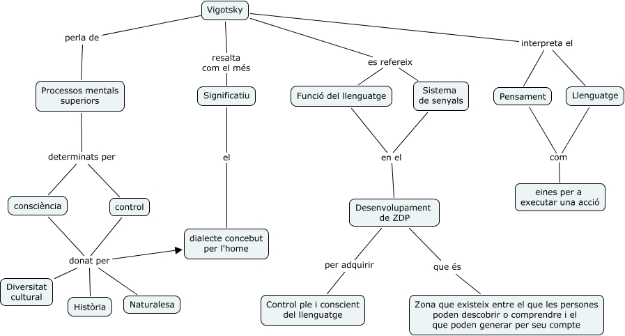 Este Cmap, tiene información relacionada con: Vogotsky, control donat per Naturalesa, Desenvolupament de ZDP que és Zona que existeix entre el que les persones poden descobrir o comprendre i el que poden generar per seu compte, Llenguatge com eines per a executar una acció, Sistema de senyals en el Desenvolupament de ZDP, consciència donat per Història, Significatiu el dialecte concebut per l'home, consciència donat per Naturalesa, Processos mentals superiors determinats per control, control donat per Història, Vigotsky resalta com el més Significatiu, consciència donat per dialecte concebut per l'home, Vigotsky interpreta el Llenguatge, Vigotsky perla de Processos mentals superiors, Desenvolupament de ZDP per adquirir Control ple i conscient del llenguatge, Funció del llenguatge en el Desenvolupament de ZDP, control donat per dialecte concebut per l'home, Processos mentals superiors determinats per consciència, consciència donat per Diversitat cultural, control donat per Diversitat cultural, Vigotsky es refereix Sistema de senyals