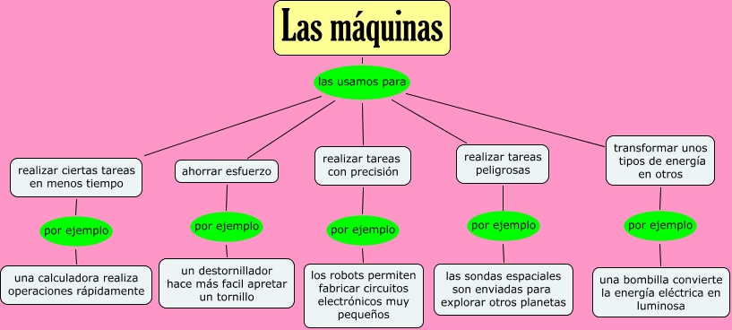 Este Cmap, tiene información relacionada con: Las máquinas, Las máquinas las usamos para ahorrar esfuerzo, Las máquinas las usamos para realizar tareas peligrosas, realizar ciertas tareas en menos tiempo por ejemplo una calculadora realiza operaciones rápidamente, realizar tareas peligrosas por ejemplo las sondas espaciales son enviadas para explorar otros planetas, Las máquinas las usamos para realizar tareas con precisión, Las máquinas las usamos para realizar ciertas tareas en menos tiempo, realizar tareas con precisión por ejemplo los robots permiten fabricar circuitos electrónicos muy pequeños, Las máquinas las usamos para transformar unos tipos de energía en otros, transformar unos tipos de energía en otros por ejemplo una bombilla convierte la energía eléctrica en luminosa, ahorrar esfuerzo por ejemplo un destornillador hace más facil apretar un tornillo