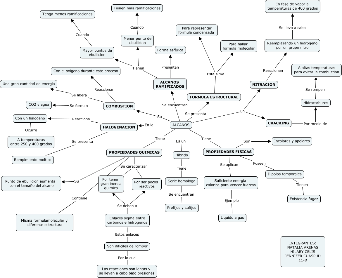 Este Cmap, tiene información relacionada con: alcanos natalia arenas hilary y jenifer cuaspud, ALCANOS Se encuentran ALCANOS RAMIFICADOS, COMBUSTION Se forman CO2 y agua, PROPIEDADES QUIMICAS Se caracterizan Por ser pocos reactivos, Menor punto de ebullicion Cuando Tienen mas ramificaciones, Enlaces sigma entre carbonos e hidrogenos Estos enlaces Son dificiles de romper, Hibrido Tiene Serie homologa, PROPIEDADES FISICAS Poseen Dipolos temporales, Con un halogeno Ocurre A temperaturas entre 250 y 400 grados, ALCANOS En NITRACION, FORMULA ESTRUCTURAL Este sirve Para hallar formula molecular, PROPIEDADES QUIMICAS Se caracterizan Por tener gran inercia quimica, Suficiente energìa calorica para vencer fuerzas Ejemplo Liquido a gas, ALCANOS RAMIFICADOS Tienen Mayor puntos de ebullicion, Enlaces sigma entre carbonos e hidrogenos Se deben a Por tener gran inercia quimica, PROPIEDADES QUIMICAS Contiene Misma formulamolecular y diferente estructura, ALCANOS Tiene PROPIEDADES QUIMICAS, Hidrocarburos Se rompen A altas temperaturas para evitar la combustion, Mayor puntos de ebullicion Cuando Tenga menos ramificaciones, HALOGENACION Reacciona Con un halogeno, CRACKING Por medio de Hidrocarburos