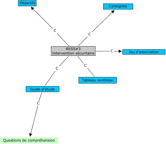 Cette carte de concepts créée avec IHMC CmapTools traite de: RESS3, RESS#3 Intervention sécuritaire C Jeu d'association, RESS#3 Intervention sécuritaire C Tableau synthèse, Guide d'étude C Questions de compréhension, RESS#3 Intervention sécuritaire C Consignes, RESS#3 Intervention sécuritaire C Objectifs, RESS#3 Intervention sécuritaire C Guide d'étude