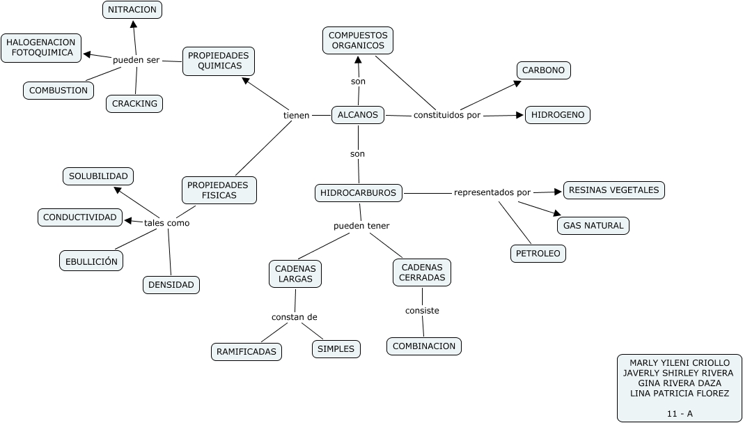 Este Cmap, tiene información relacionada con: HIDROCARBUROS ( criollo, florez, rivera, rivera), ALCANOS son COMPUESTOS ORGANICOS, ALCANOS son HIDROCARBUROS, HIDROCARBUROS pueden tener CADENAS CERRADAS, HIDROCARBUROS representados por RESINAS VEGETALES, PROPIEDADES QUIMICAS pueden ser NITRACION, CADENAS LARGAS constan de SIMPLES, PROPIEDADES FISICAS tales como DENSIDAD, ALCANOS tienen PROPIEDADES FISICAS, ALCANOS constituidos por CARBONO, CADENAS LARGAS constan de RAMIFICADAS, PROPIEDADES FISICAS tales como SOLUBILIDAD, CADENAS CERRADAS consiste COMBINACION, COMPUESTOS ORGANICOS constituidos por HIDROGENO, PROPIEDADES QUIMICAS pueden ser HALOGENACION FOTOQUIMICA, ALCANOS constituidos por HIDROGENO, PROPIEDADES QUIMICAS pueden ser CRACKING, PROPIEDADES FISICAS tales como EBULLICIÓN, HIDROCARBUROS representados por PETROLEO, ALCANOS tienen PROPIEDADES QUIMICAS, HIDROCARBUROS representados por GAS NATURAL
