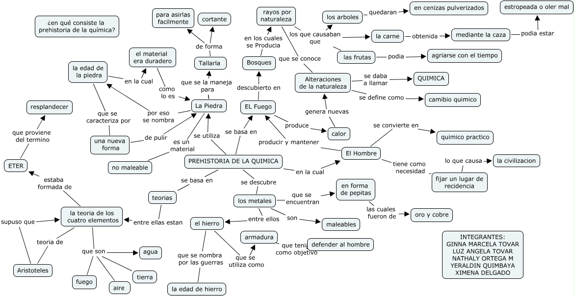 Este Cmap, tiene información relacionada con: GINNA TOVAR , LUZ TOVAR, NATALY ORTEGA, YERALDIN QUIMBAYA, XIMENA DELGADO, los arboles quedaran en cenizas pulverizados, PREHISTORIA DE LA QUIMICA se descubre los metales, Tallarla de forma cortante, la teoria de los cuatro elementos teoria de Aristoteles, la teoria de los cuatro elementos estaba formada de ETER, PREHISTORIA DE LA QUIMICA se basa en EL Fuego, Alteraciones de la naturaleza se daba a llamar QUIMICA, rayos por naturaleza los que causaban que las frutas, PREHISTORIA DE LA QUIMICA se basa en teorias, la teoria de los cuatro elementos que son fuego, rayos por naturaleza los que causaban que la carne, la edad de la piedra en la cual el material era duradero, EL Fuego produce calor, La Piedra es un material no maleable, PREHISTORIA DE LA QUIMICA se utiliza La Piedra, El Hombre tiene como necesidad fijar un lugar de recidencia, los metales son maleables, mediante la caza podia estar estropeada o oler mal, teorias entre ellas estan la teoria de los cuatro elementos, el hierro que se utiliza como armadura