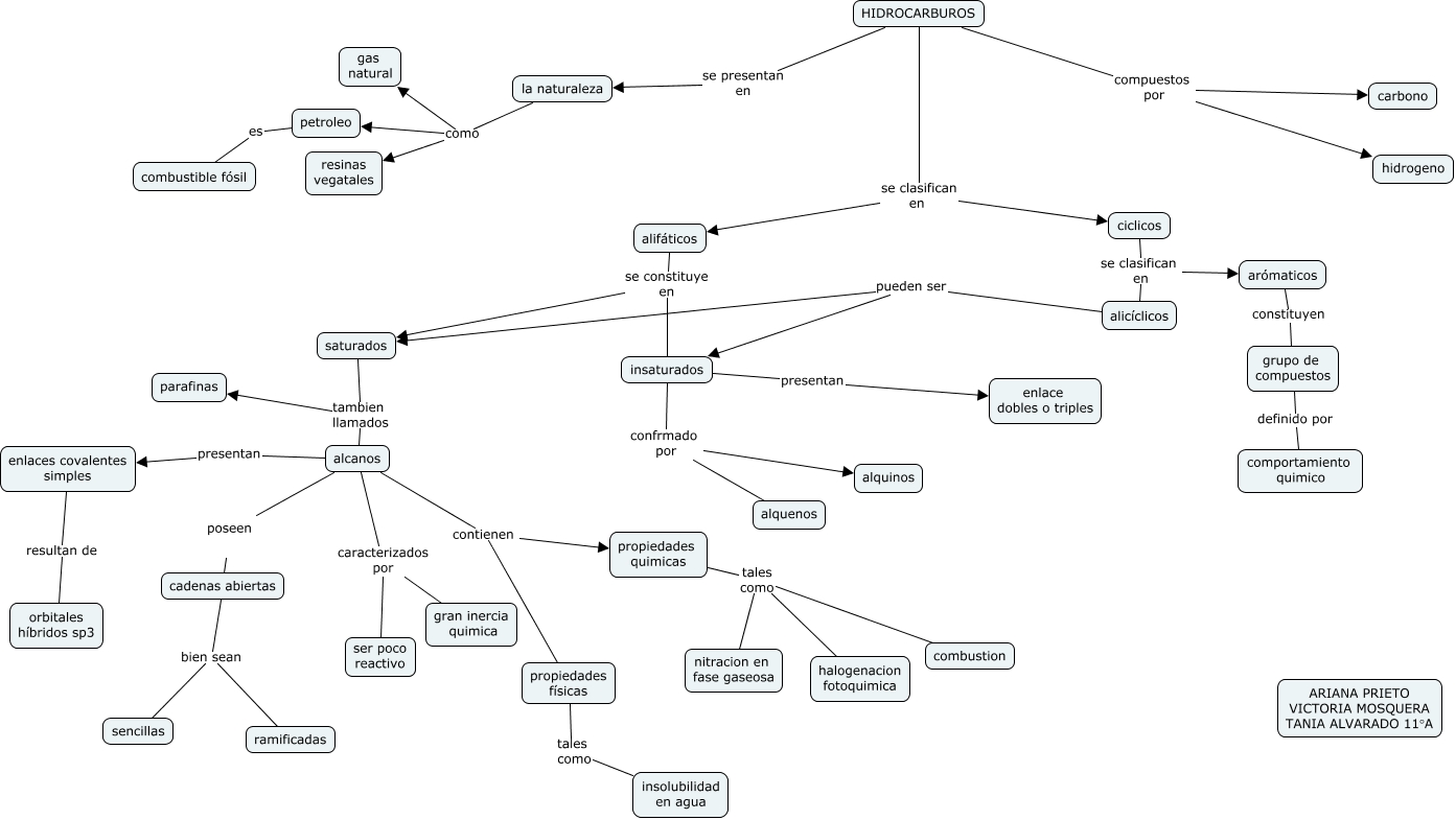 Este Cmap, tiene información relacionada con: HIDROCARBUROS Prieto, mosquera, alvarado, insaturados confrmado por alquenos, alicíclicos pueden ser saturados, HIDROCARBUROS compuestos por carbono, ciclicos se clasifican en arómaticos, petroleo es combustible fósil, alicíclicos pueden ser insaturados, alcanos presentan enlaces covalentes simples, cadenas abiertas bien sean sencillas, la naturaleza como petroleo, cadenas abiertas bien sean ramificadas, alcanos contienen propiedades quimicas, alcanos caracterizados por ser poco reactivo, la naturaleza como gas natural, grupo de compuestos definido por comportamiento quimico, insaturados presentan enlace dobles o triples, alcanos contienen propiedades físicas, alifáticos se constituye en saturados, HIDROCARBUROS se clasifican en alifáticos, propiedades quimicas tales como halogenacion fotoquimica, alcanos caracterizados por gran inercia quimica