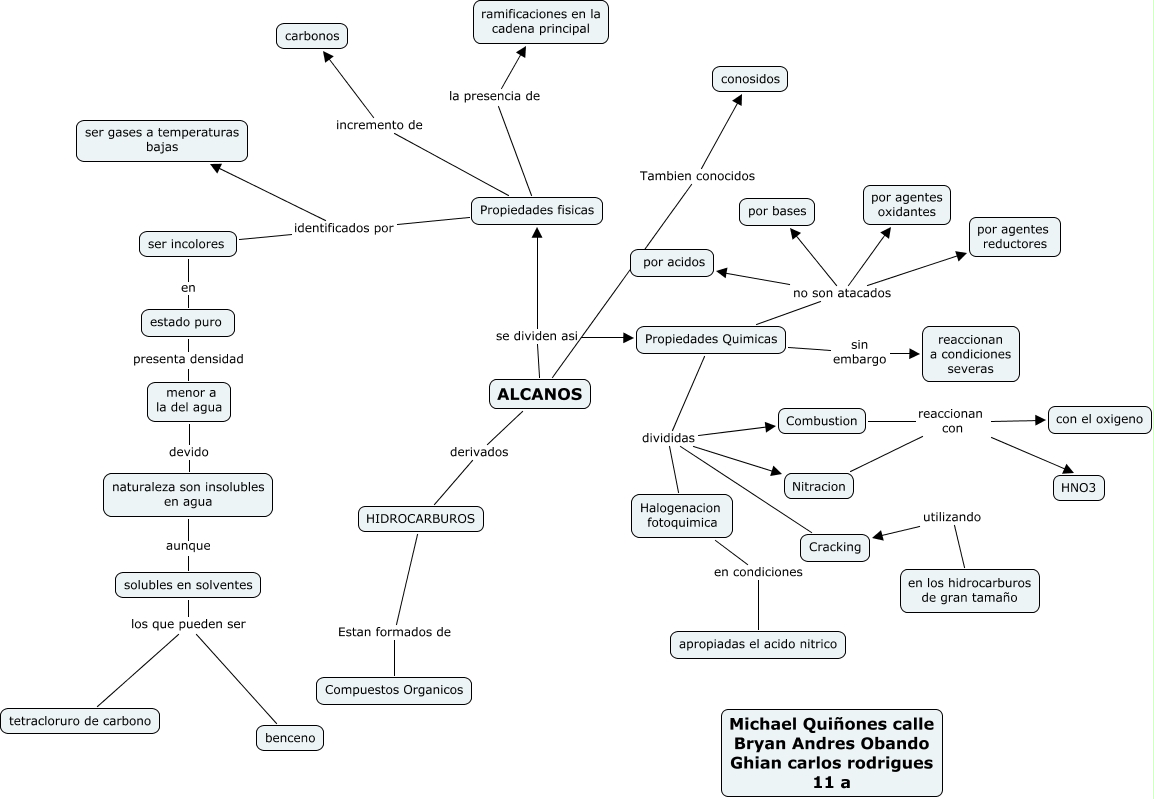 Este Cmap, tiene información relacionada con: ALCANOS MICHAEL, Halogenacion fotoquimica en condiciones apropiadas el acido nitrico, ser incolores identificados por ser gases a temperaturas bajas, naturaleza son insolubles en agua aunque solubles en solventes, Nitracion reaccionan con HNO3, Propiedades Quimicas divididas Combustion, solubles en solventes los que pueden ser tetracloruro de carbono, Propiedades Quimicas divididas Cracking, en los hidrocarburos de gran tamaño utilizando Cracking, Combustion reaccionan con HNO3, Propiedades Quimicas no son atacados por agentes oxidantes, menor a la del agua devido naturaleza son insolubles en agua, Propiedades Quimicas sin embargo reaccionan a condiciones severas, ALCANOS derivados HIDROCARBUROS, Propiedades Quimicas no son atacados por acidos, Combustion reaccionan con con el oxigeno, ALCANOS se dividen asi Propiedades fisicas, Propiedades fisicas identificados por ser gases a temperaturas bajas, estado puro presenta densidad menor a la del agua, Propiedades fisicas incremento de carbonos, Nitracion reaccionan con con el oxigeno