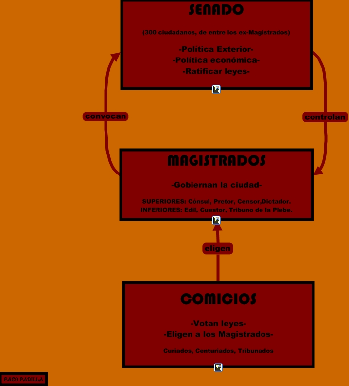 Este Cmap, tiene información relacionada con: REPUBLICA ROMANA, SENADO (300 ciudadanos, de entre los ex-Magistrados) -Política Exterior- -Política económica- -Ratificar leyes- controlan MAGISTRADOS -Gobiernan la ciudad- SUPERIORES: Cónsul, Pretor, Censor,Dictador. INFERIORES: Edil, Cuestor, Tribuno de la Plebe., COMICIOS -Votan leyes- -Eligen a los Magistrados- Curiados, Centuriados, Tribunados eligen MAGISTRADOS -Gobiernan la ciudad- SUPERIORES: Cónsul, Pretor, Censor,Dictador. INFERIORES: Edil, Cuestor, Tribuno de la Plebe., MAGISTRADOS -Gobiernan la ciudad- SUPERIORES: Cónsul, Pretor, Censor,Dictador. INFERIORES: Edil, Cuestor, Tribuno de la Plebe. convocan SENADO (300 ciudadanos, de entre los ex-Magistrados) -Política Exterior- -Política económica- -Ratificar leyes-