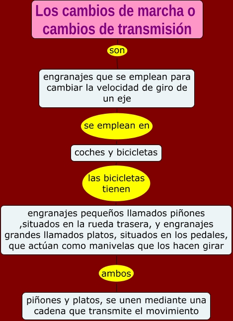 Este Cmap, tiene información relacionada con: Los cambios de marcha, engranajes pequeños llamados piñones ,situados en la rueda trasera, y engranajes grandes llamados platos, situados en los pedales, que actúan como manivelas que los hacen girar ambos piñones y platos, se unen mediante una cadena que transmite el movimiento, Los cambios de marcha o cambios de transmisión son engranajes que se emplean para cambiar la velocidad de giro de un eje, engranajes que se emplean para cambiar la velocidad de giro de un eje se emplean en coches y bicicletas, coches y bicicletas las bicicletas tienen engranajes pequeños llamados piñones ,situados en la rueda trasera, y engranajes grandes llamados platos, situados en los pedales, que actúan como manivelas que los hacen girar