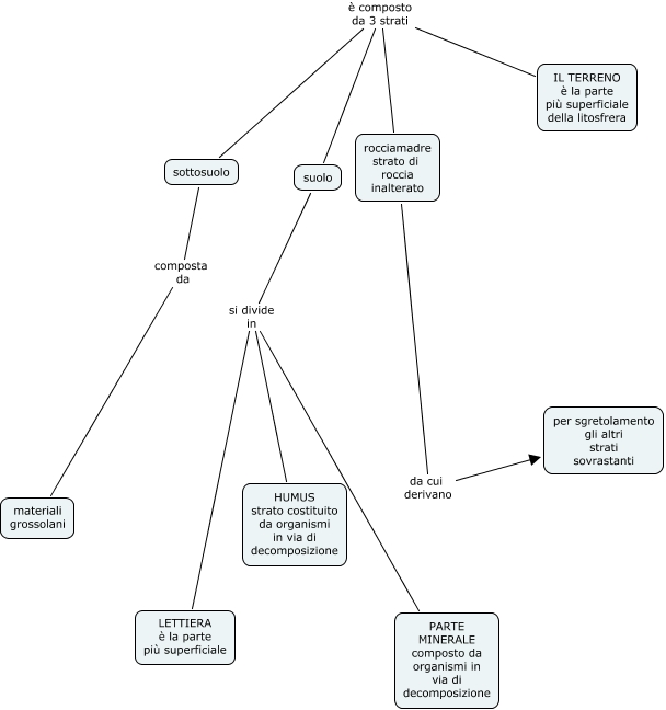 Questa Cmap, creata con IHMC CmapTools, contiene informazioni relative a: il suolo bea ed ery da finire, IL TERRENO è la parte più superficiale della litosfrera è composto da 3 strati sottosuolo, rocciamadre strato di roccia inalterato da cui derivano per sgretolamento gli altri strati sovrastanti, IL TERRENO è la parte più superficiale della litosfrera è composto da 3 strati rocciamadre strato di roccia inalterato, suolo si divide in HUMUS strato costituito da organismi in via di decomposizione, suolo si divide in LETTIERA è la parte più superficiale, suolo si divide in PARTE MINERALE composto da organismi in via di decomposizione, sottosuolo composta da materiali grossolani, IL TERRENO è la parte più superficiale della litosfrera è composto da 3 strati suolo