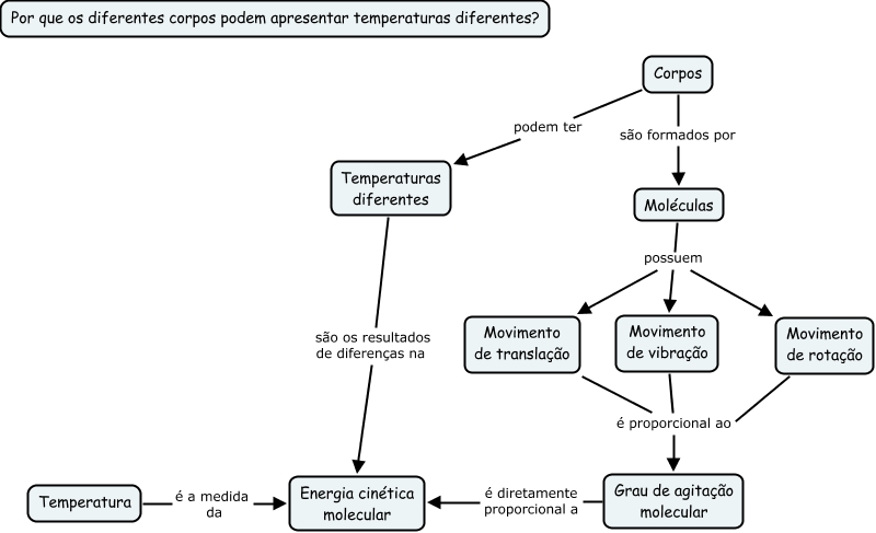 Esse mapa conceitual, produzido no IHMC CmapTools, tem a informação relacionada a: Temperaturas diferentes 3A, Corpos podem ter Temperaturas diferentes, Movimento de vibração é proporcional ao Grau de agitação molecular, Moléculas possuem Movimento de rotação, Moléculas possuem Movimento de translação, Corpos são formados por Moléculas, Moléculas possuem Movimento de vibração, Temperatura é a medida da Energia cinética molecular, Grau de agitação molecular é diretamente proporcional a Energia cinética molecular, Movimento de rotação é proporcional ao Grau de agitação molecular, Temperaturas diferentes são os resultados de diferenças na Energia cinética molecular, Movimento de translação é proporcional ao Grau de agitação molecular