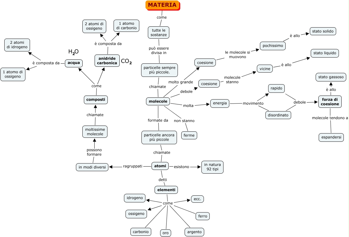 Questa Cmap, creata con IHMC CmapTools, contiene informazioni relative a: MATERIA 2, molecole formate da particelle ancora più piccole, elementi come ecc., MATERIA come tutte le sostanze, atomi detti elementi, coesione molecole stanno vicine, molecole debole coesione, acqua è composta da 2 atomi di idrogeno, in modi diversi possono formare moltissime molecole, energia movimento disordinato, composti come anidride carbonica, elementi come carbonio, elementi come argento, forza di coesione è allo stato gassoso, moltissime molecole chiamate composti, energia movimento rapido, molecole molto grande coesione, molecole molta energia, composti come acqua, forza di coesione molecole tendono a espandersi, elementi come ferro