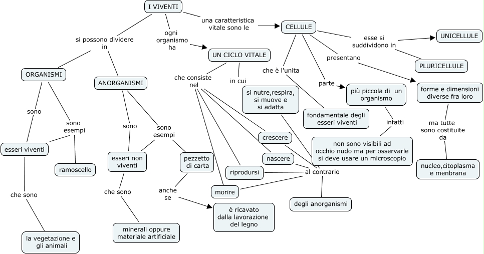 Questa Cmap, creata con IHMC CmapTools, contiene informazioni relative a: GLI ORGANIMI, UN CICLO VITALE che consiste nel morire, I VIVENTI ogni organismo ha UN CICLO VITALE, riprodursi al contrario degli anorganismi, UN CICLO VITALE che consiste nel riprodursi, ORGANISMI sono esseri viventi, I VIVENTI una caratteristica vitale sono le CELLULE, I VIVENTI si possono dividere in ORGANISMI, esseri viventi sono esempi ramoscello, ANORGANISMI sono esseri non viventi, pezzetto di carta anche se è ricavato dalla lavorazione del legno, I VIVENTI si possono dividere in ANORGANISMI, si nutre,respira, si muove e si adatta al contrario degli anorganismi, morire al contrario degli anorganismi, CELLULE presentano forme e dimensioni diverse fra loro, CELLULE esse si suddividono in UNICELLULE, UN CICLO VITALE in cui si nutre,respira, si muove e si adatta, CELLULE parte più piccola di un organismo, CELLULE esse si suddividono in PLURICELLULE, UN CICLO VITALE che consiste nel crescere, forme e dimensioni diverse fra loro ma tutte sono costituite da nucleo,citoplasma e menbrana