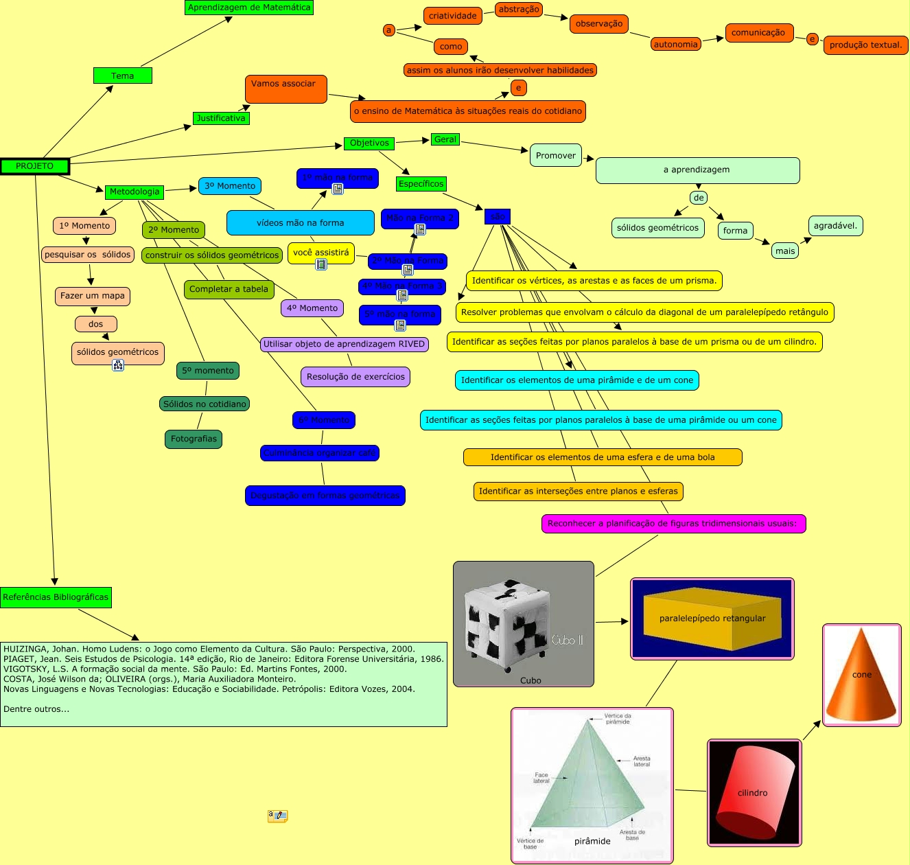 Esse mapa conceitual, produzido no IHMC CmapTools, tem a informação relacionada a: Projeto Aprendizagem de Matemática, PROJETO Metodologia 5º momento, 4º Momento Utilisar objeto de aprendizagem RIVED Resolução de exercícios, 2º Momento construir os sólidos geométricos Completar a tabela, PROJETO Metodologia 1º Momento, observação autonomia comunicação, Mão na Forma 2 4º Mão na Forma 3 5º mão na forma, Específicos são Identificar as seções feitas por planos paralelos à base de um prisma ou de um cilindro., 3º Momento vídeos mão na forma você assistirá, 3º Momento vídeos mão na forma 1º mão na forma, Reconhecer a planificação de figuras tridimensionais usuais: Cubo paralelepípedo retangular, Específicos são Identificar os elementos de uma esfera e de uma bola, Geral Promover a aprendizagem, PROJETO Objetivos Geral, a aprendizagem de sólidos geométricos, Fazer um mapa dos sólidos geométricos, paralelepípedo retangular Prismas retos pirâmide, comunicação e produção textual., PROJETO Metodologia 2º Momento, forma mais agradável., a aprendizagem de forma