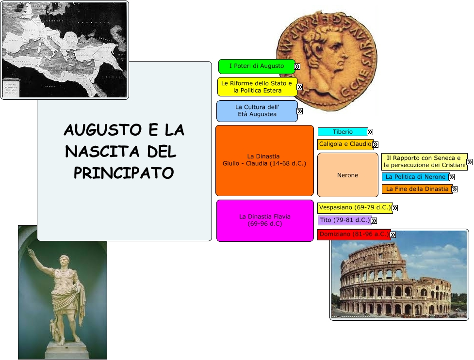 Questa Cmap, creata con IHMC CmapTools, contiene informazioni relative a: L'Impero Romano [Augusto e la Nascita del Principato] Manzoni, NERONE durante i primi anni di governo, fu profondamente influenzato da: Seneca, Nuove Cariche divise in: ORDINE EQUESTRE -prefettura del pretorio -prefettura dell'annona -prefettura dei vigili -prefetture della flotta -prefettura d'Egitto, Pretoriani che proclamarono imperatore suo zio: CLAUDIO, A Vespasiano successe il figlio: TITO, TITO che, nonostante governò per un tempo troppo breve, si impegnò a soccorrere le popolazioni (Pompei, Ercolano, Stabia) colpite da: Eruzione VESUVIO, Diverse Trame per abbatterlo provocando, in seguito alla ribellione di alcune legioni e pretoriani,: Il Suicidio dell'Imperatore, IMPERIO PROCONSOLARE Potere dei ProConsoli, Provvedimenti Risanamento Finanze Pubbliche, Molti Delitti Seneca, Lucano e Petronio, Ottaviano dopo essere ritornato a Roma nel 29 a.C., assunse: La Carica Suprema di PONTEFICE MASSIMO (12 a.C.), Ottaviano dopo essere ritornato a Roma nel 29 a.C., assunse: Il Titolo di Pater Patriae (2 d.C), DOMIZIANO che assunse un atteggiamento autoritario e fu promotore di vari: Provvedimenti, RAPPORTI con il Regno Partico per il: Controllo dell'Armenia, Pretoriani a causa del suo: Governo Dispotico, Seneca, Lucano e Petronio che avevano dato vita alla: Congiura dei Pisoni, Ottaviano basò il suo Governo, con poteri che non erano di pari grado a quelli altrui, su: POTESTA' TRIBUNICIA, Molti Delitti La moglie Ottavia, Gaio Cesare, soprannominato CALIGOLA che, nel 41 d.C., venne ucciso da: Pretoriani, Il Suicidio dell'Imperatore che segnò: La Fine della Dinastia Giulio - Claudia, AGRIPPINA per portare, verosmilmente, al trono: NERONE