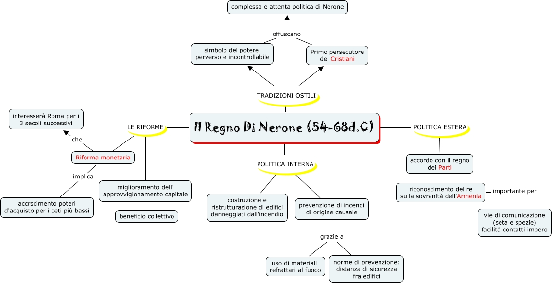 Questa Cmap, creata con IHMC CmapTools, contiene informazioni relative a: Il Regno Di Nerone (54-68dC, parte II)_(Sonzogni), accordo con il regno dei Parti ???? riconoscimento del re sulla sovranità dell'Armenia, Riforma monetaria implica accrscimento poteri d'acquisto per i ceti più bassi, Primo persecutore dei Cristiani offuscano complessa e attenta politica di Nerone, Il Regno Di Nerone (54-68d.C) LE RIFORME Riforma monetaria, Il Regno Di Nerone (54-68d.C) LE RIFORME miglioramento dell' approvvigionamento capitale, riconoscimento del re sulla sovranità dell'Armenia importante per vie di comunicazione (seta e spezie) facilità contatti impero, Riforma monetaria che interesserà Roma per i 3 secoli successivi, prevenzione di incendi di origine causale grazie a norme di prevenzione: distanza di sicurezza fra edifici, Il Regno Di Nerone (54-68d.C) TRADIZIONI OSTILI simbolo del potere perverso e incontrollabile, Il Regno Di Nerone (54-68d.C) POLITICA INTERNA prevenzione di incendi di origine causale, miglioramento dell' approvvigionamento capitale ???? beneficio collettivo, prevenzione di incendi di origine causale grazie a uso di materiali refrattari al fuoco, simbolo del potere perverso e incontrollabile offuscano complessa e attenta politica di Nerone, Il Regno Di Nerone (54-68d.C) POLITICA INTERNA costruzione e ristrutturazione di edifici danneggiati dall'incendio, Il Regno Di Nerone (54-68d.C) TRADIZIONI OSTILI Primo persecutore dei Cristiani, Il Regno Di Nerone (54-68d.C) POLITICA ESTERA accordo con il regno dei Parti