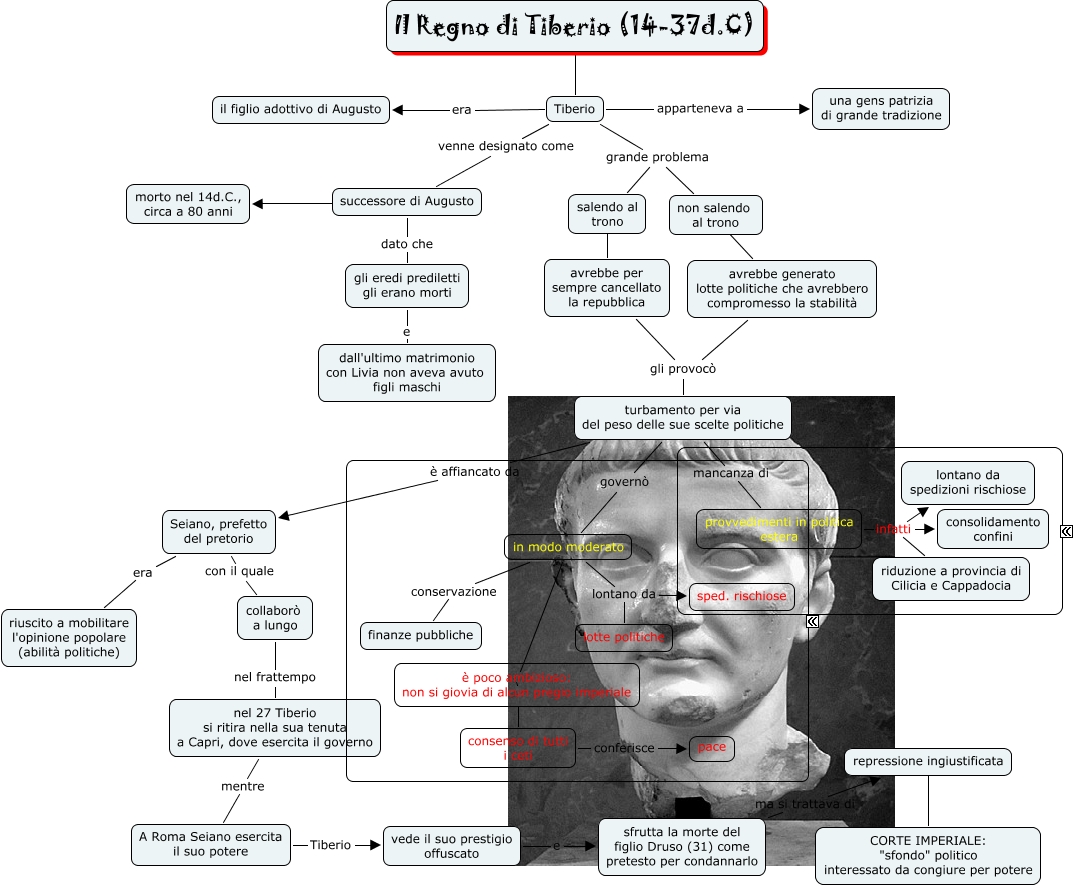 Questa Cmap, creata con IHMC CmapTools, contiene informazioni relative a: Il Regno Di Tiberio (14-37dC)_(Sonzogni), in modo moderato lontano da sped. rischiose, Tiberio era il figlio adottivo di Augusto, provvedimenti in politica estera infatti lontano da spedizioni rischiose, collaborò a lungo nel frattempo nel 27 Tiberio si ritira nella sua tenuta a Capri, dove esercita il governo, provvedimenti in politica estera infatti riduzione a provincia di Cilicia e Cappadocia, avrebbe per sempre cancellato la repubblica gli provocò turbamento per via del peso delle sue scelte politiche, Tiberio grande problema non salendo al trono, successore di Augusto ???? morto nel 14d.C., circa a 80 anni, non salendo al trono ???? avrebbe generato lotte politiche che avrebbero compromesso la stabilità, repressione ingiustificata ???? CORTE IMPERIALE: "sfondo" politico interessato da congiure per potere, successore di Augusto dato che gli eredi prediletti gli erano morti, turbamento per via del peso delle sue scelte politiche è affiancato da Seiano, prefetto del pretorio, gli eredi prediletti gli erano morti e dall'ultimo matrimonio con Livia non aveva avuto figli maschi, salendo al trono ???? avrebbe per sempre cancellato la repubblica, in modo moderato conservazione finanze pubbliche, è poco ambizioso: non si giovia di alcun pregio imperiale consenso di tutti i ceti, turbamento per via del peso delle sue scelte politiche governò in modo moderato, in modo moderato è poco ambizioso: non si giovia di alcun pregio imperiale, in modo moderato lontano da lotte politiche, sfrutta la morte del figlio Druso (31) come pretesto per condannarlo ma si trattava di repressione ingiustificata