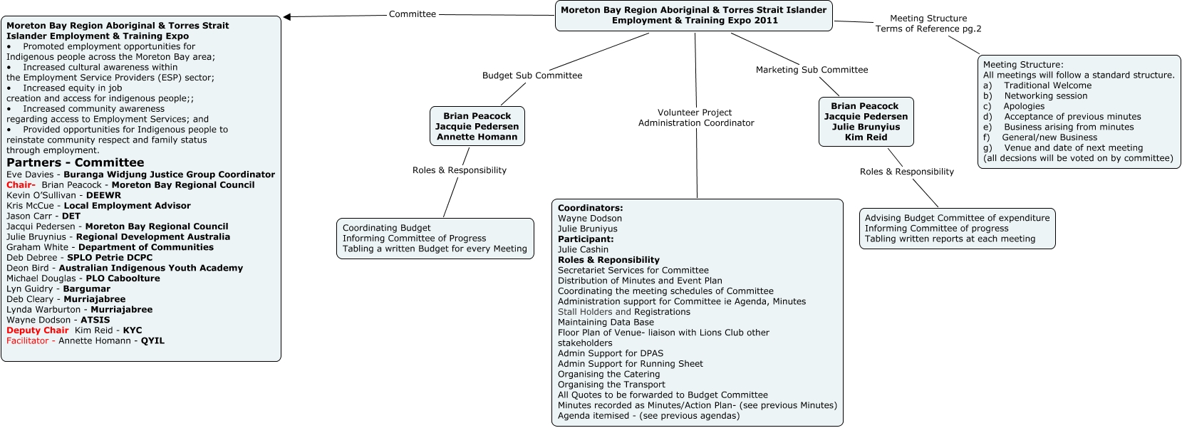 This Concept Map, created with IHMC CmapTools, has information related to: Indigenous Employment Expo, Brian Peacock Jacquie Pedersen Annette Homann Roles & Responsibility Coordinating Budget Informing Committee of Progress Tabling a written Budget for every Meeting, Moreton Bay Region Aboriginal & Torres Strait Islander Employment & Training Expo 2011 Budget Sub Committee Brian Peacock Jacquie Pedersen Annette Homann, Brian Peacock Jacquie Pedersen Julie Brunyius Kim Reid Roles & Responsibility Advising Budget Committee of expenditure Informing Committee of progress Tabling written reports at each meeting, Moreton Bay Region Aboriginal & Torres Strait Islander Employment & Training Expo 2011 Meeting Structure Terms of Reference pg.2 Meeting Structure: All meetings will follow a standard structure. a) Traditional Welcome b) Networking session c) Apologies d) Acceptance of previous minutes e) Business arising from minutes f) General/new Business g) Venue and date of next meeting (all decsions will be voted on by committee), Moreton Bay Region Aboriginal & Torres Strait Islander Employment & Training Expo 2011 Volunteer Project Administration Coordinator Coordinators: Wayne Dodson Julie Bruniyus Participant: Julie Cashin Roles & Reponsibility Secretariet Services for Committee Distribution of Minutes and Event Plan Coordinating the meeting schedules of Committee Administration support for Committee ie Agenda, Minutes Stall Holders and Registrations Maintaining Data Base Floor Plan of Venue- liaison with Lions Club other stakeholders Admin Support for DPAS Admin Support for Running Sheet Organising the Catering Organising the Transport All Quotes to be forwarded to Budget Committee Minutes recorded as Minutes/Action Plan- (see previous Minutes) Agenda itemised - (see previous agendas), Moreton Bay Region Aboriginal & Torres Strait Islander Employment & Training Expo 2011 Marketing Sub Committee Brian Peacock Jacquie Pedersen Julie Brunyius Kim Reid, Moreton Bay Region Aboriginal & Torres Strait Islander Employment & Training Expo 2011 Committee Moreton Bay Region Aboriginal & Torres Strait Islander Employment & Training Expo • Promoted employment opportunities for Indigenous people across the Moreton Bay area; • Increased cultural awareness within the Employment Service Providers (ESP) sector; • Increased equity in job creation and access for indigenous people;; • Increased community awareness regarding access to Employment Services; and • Provided opportunities for Indigenous people to reinstate community respect and family status through employment. Partners - Committee Eve Davies - Buranga Widjung Justice Group Coordinator Chair- Brian Peacock - Moreton Bay Regional Council Kevin O’Sullivan - DEEWR Kris McCue - Local Employment Advisor Jason Carr - DET Jacqui Pedersen - Moreton Bay Regional Council Julie Bruynius - Regional Development Australia Graham White - Department of Communities Deb Debree - SPLO Petrie DCPC Deon Bird - Australian Indigenous Youth Academy Michael Douglas - PLO Caboolture Lyn Guidry - Bargumar Deb Cleary - Murriajabree Lynda Warburton - Murriajabree Wayne Dodson - ATSIS Deputy Chair Kim Reid - KYC Facilitator - Annette Homann - QYIL