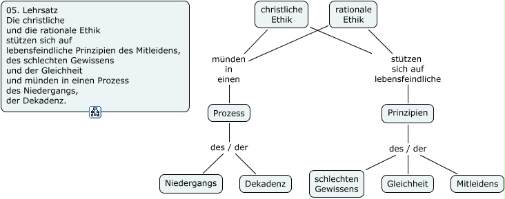 Dieses mit IHMC CmapTools erstellte CMap hat Informationen bezüglich: 05. Lehrsatz, Prozess des / der Dekadenz, Prinzipien des / der schlechten Gewissens, Prinzipien des / der Gleichheit, Prozess des / der Niedergangs, christliche Ethik münden in einen Prozess, christliche Ethik stützen sich auf lebensfeindliche Prinzipien, rationale Ethik münden in einen Prozess, Prinzipien des / der Mitleidens, rationale Ethik stützen sich auf lebensfeindliche Prinzipien