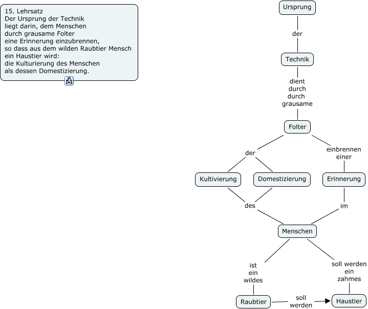 Dieses mit IHMC CmapTools erstellte CMap hat Informationen bezüglich: 15. Lehrsatz, Folter der Domestizierung, Kultivierung des Menschen, Erinnerung im Menschen, Menschen soll werden ein zahmes Haustier, Raubtier soll werden Haustier, Folter der Kultivierung, Ursprung der Technik, Menschen ist ein wildes Raubtier, Technik dient durch durch grausame Folter, Domestizierung des Menschen, Folter einbrennen einer Erinnerung