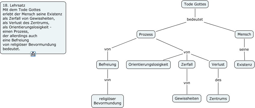 Dieses mit IHMC CmapTools erstellte CMap hat Informationen bezüglich: 18. Lehrsatz, Mensch seine Existenz, Zerfall von Gewissheiten, Tode Gottes bedeutet Mensch, Prozess von Verlust, Prozess von Orientierungslosigkeit, Prozess von Befreiung, Befreiung von religiöser Bevormundung, Prozess von Zerfall, Tode Gottes bedeutet Prozess, Verlust des Zentrums