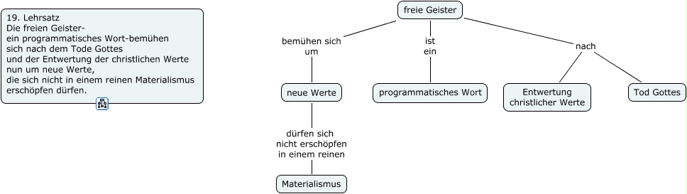 Dieses mit IHMC CmapTools erstellte CMap hat Informationen bezüglich: 19. Lehrsatz, freie Geister nach Entwertung christlicher Werte, freie Geister bemühen sich um neue Werte, freie Geister ist ein programmatisches Wort, freie Geister nach Tod Gottes, neue Werte dürfen sich nicht erschöpfen in einem reinen Materialismus