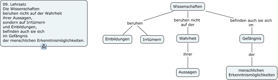Dieses mit IHMC CmapTools erstellte CMap hat Informationen bezüglich: 09. Lehrsatz, Wahrheit ihrer Aussagen, Gefängnis der menschlichen Erkenntnismöglichkeiten, Wissenschaften beruhen nicht auf der Wahrheit, Wissenschaften befinden auch sie sich im Gefängnis, Wissenschaften beruhen Irrtümern, Wissenschaften beruhen Einbildungen