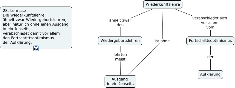 Dieses mit IHMC CmapTools erstellte CMap hat Informationen bezüglich: 28. Lehrsatz, Wiedergeburtslehren lehrten meist Ausgang in ein Jenseits, Wiederkunftslehre ist ohne Ausgang in ein Jenseits, Wiederkunftslehre verabschiedet sich vor allem vom Fortschrittsoptimismus, Fortschrittsoptimismus der Aufklärung, Wiederkunftslehre ähnelt zwar den Wiedergeburtslehren
