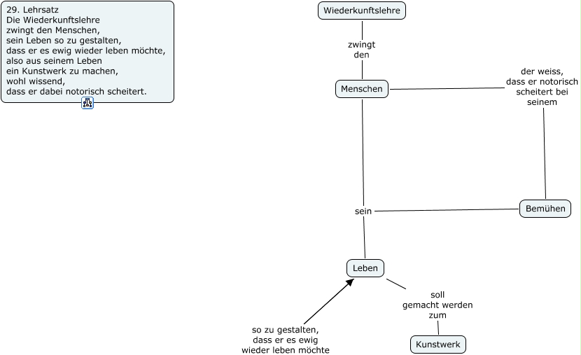 Dieses mit IHMC CmapTools erstellte CMap hat Informationen bezüglich: 29. Lehrsatz, Menschen sein Leben, Bemühen sein Leben, Wiederkunftslehre zwingt den Menschen, Menschen der weiss, dass er notorisch scheitert bei seinem Bemühen, Leben soll gemacht werden zum Kunstwerk