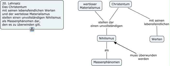 Dieses mit IHMC CmapTools erstellte CMap hat Informationen bezüglich: 20. Lehrsatz, Nihilismus als Massenphänomen, wertloser Materialismus stellen dar einen unvollständigen Nihilismus, Christentum mit seinen lebensfeindlichen Werten, Christentum stellen dar einen unvollständigen Nihilismus