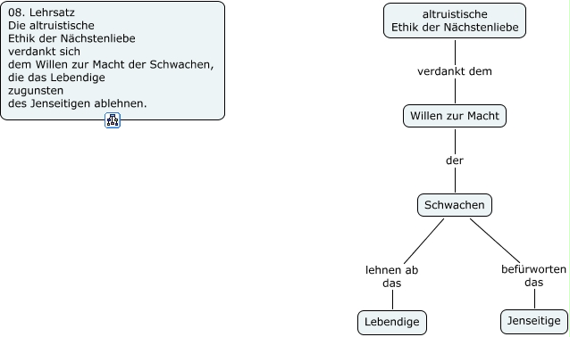 Dieses mit IHMC CmapTools erstellte CMap hat Informationen bezüglich: 08. Lehrsatz, Willen zur Macht der Schwachen, altruistische Ethik der Nächstenliebe verdankt dem Willen zur Macht, Schwachen lehnen ab das Lebendige, Schwachen befürworten das Jenseitige