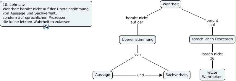 Dieses mit IHMC CmapTools erstellte CMap hat Informationen bezüglich: 10. Lehrsatz, Übereinstimmung von Aussage, Wahrheit beruht nicht auf der Übereinstimmung, Wahrheit beruht auf sprachlichen Prozessen, Aussage und Sachverhalt,, Übereinstimmung von Sachverhalt,, sprachlichen Prozessen lassen nicht zu letzte Wahrheiten
