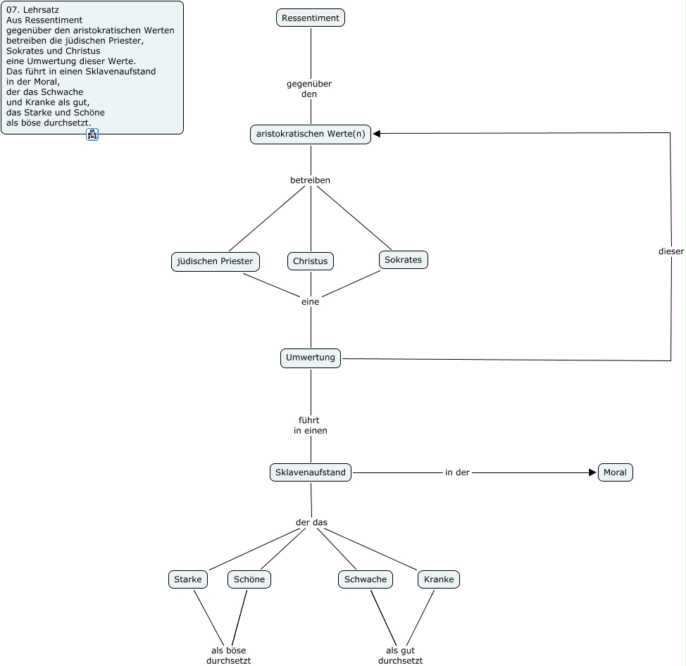 Dieses mit IHMC CmapTools erstellte CMap hat Informationen bezüglich: 07. Lehrsatz, Umwertung führt in einen Sklavenaufstand, Sokrates eine Umwertung, Sklavenaufstand der das Kranke, Kranke als gut durchsetzt Schwache, Sklavenaufstand in der Moral, aristokratischen Werte(n) betreiben jüdischen Priester, Starke als böse durchsetzt Schöne, Sklavenaufstand der das Schwache, Umwertung dieser aristokratischen Werte(n), Sklavenaufstand der das Schöne, Sklavenaufstand der das Starke, Ressentiment gegenüber den aristokratischen Werte(n), jüdischen Priester eine Umwertung, aristokratischen Werte(n) betreiben Christus, Christus eine Umwertung, aristokratischen Werte(n) betreiben Sokrates