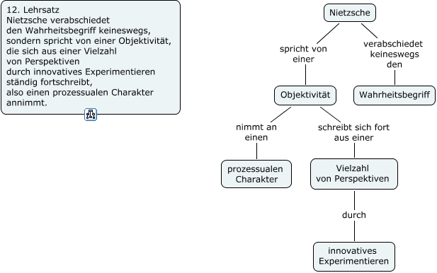 Dieses mit IHMC CmapTools erstellte CMap hat Informationen bezüglich: 12. Lehrsatz, Objektivität schreibt sich fort aus einer Vielzahl von Perspektiven, Nietzsche verabschiedet keineswegs den Wahrheitsbegriff, Vielzahl von Perspektiven durch innovatives Experimentieren, Objektivität nimmt an einen prozessualen Charakter, Nietzsche spricht von einer Objektivität