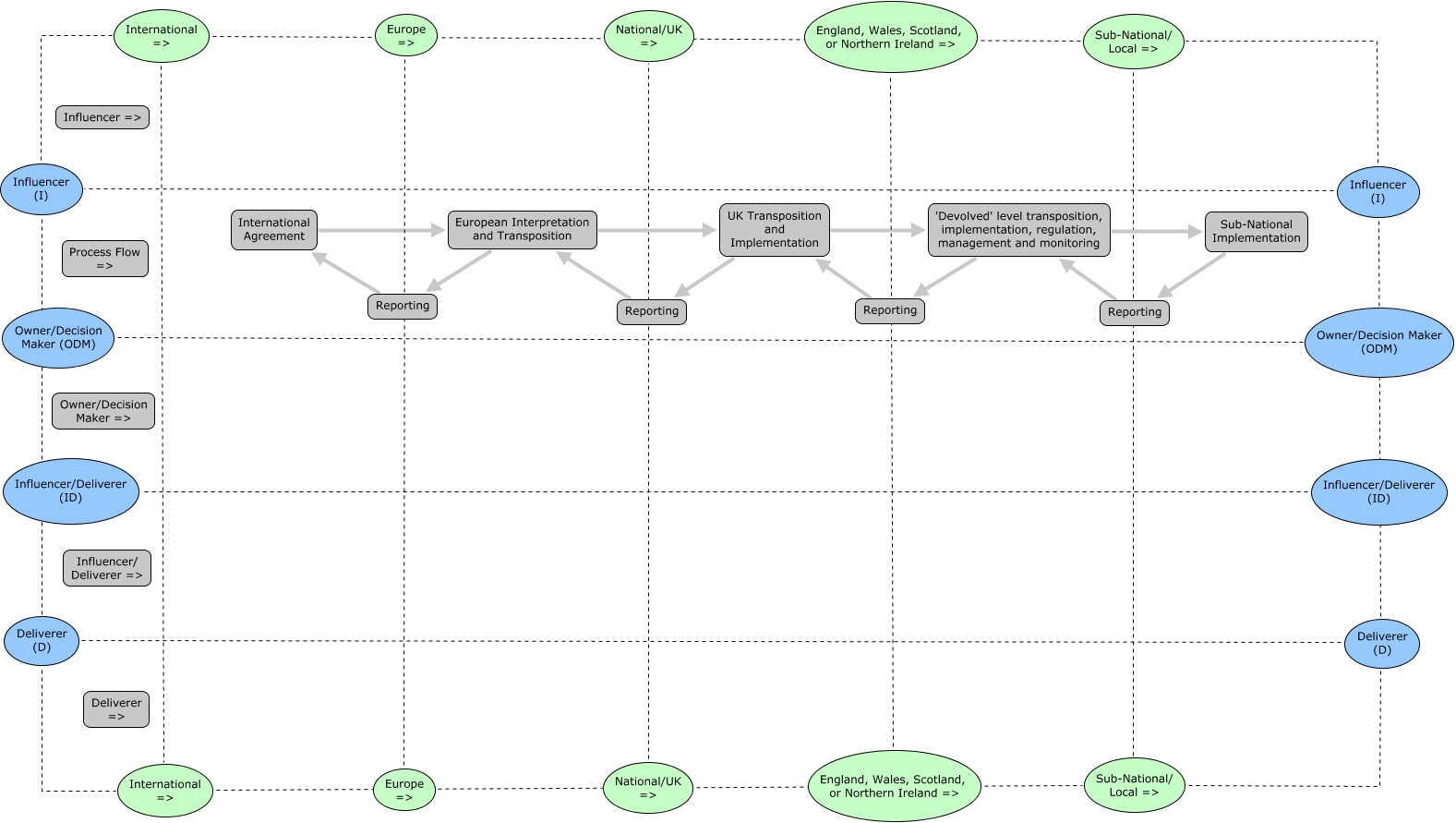 This Concept Map, created with IHMC CmapTools, has information related to: gen3 actor template, England, Wales, Scotland, or Northern Ireland => England, Wales, Scotland, or Northern Ireland =>, Sub-National/ Local => Sub-National/ Local =>, Influencer (I) Deliverer (D), Sub-National Implementation Reporting, Reporting 'Devolved' level transposition, implementation, regulation, management and monitoring, International => Sub-National/ Local =>, Europe => Europe =>, Deliverer (D) Deliverer (D), Reporting UK Transposition and Implementation, International => Sub-National/ Local =>, Influencer (I) Sub-National/ Local =>, UK Transposition and Implementation 'Devolved' level transposition, implementation, regulation, management and monitoring, Influencer (I) International =>, Sub-National/ Local => Deliverer (D), International Agreement European Interpretation and Transposition, UK Transposition and Implementation Reporting, Influencer (I) Deliverer (D), International => International =>, 'Devolved' level transposition, implementation, regulation, management and monitoring Reporting, Reporting International Agreement