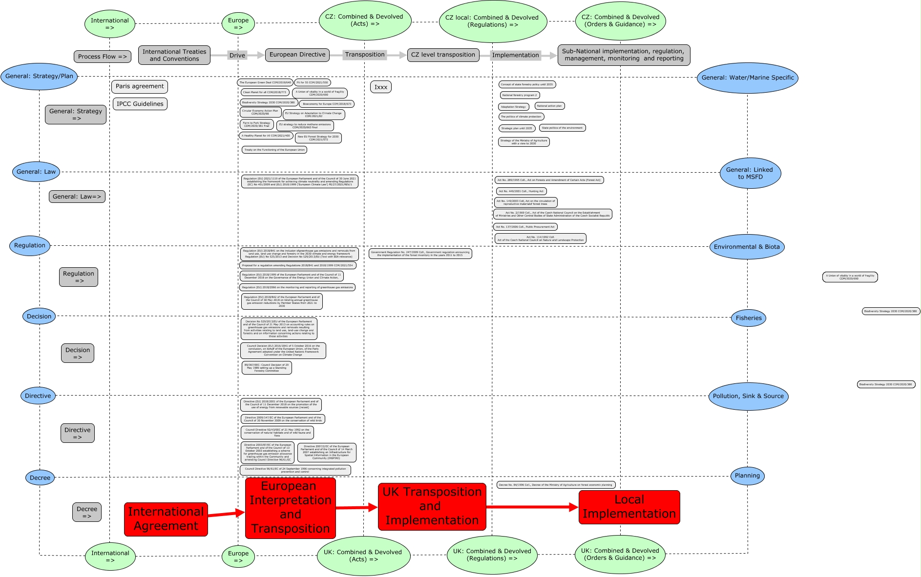 This Concept Map, created with IHMC CmapTools, has information related to: gen3 instrument template, Directive Pollution, Sink & Source, International => UK: Combined & Devolved (Orders & Guidance) =>, UK Transposition and Implementation Local Implementation, International Agreement European Interpretation and Transposition, UK: Combined & Devolved (Orders & Guidance) => Planning, UK: Combined & Devolved (Acts) => CZ: Combined & Devolved (Acts) =>, UK: Combined & Devolved (Regulations) => CZ local: Combined & Devolved (Regulations) =>, General: Strategy/Plan General: Water/Marine Specific, Decree General: Strategy/Plan, European Interpretation and Transposition UK Transposition and Implementation, International => CZ: Combined & Devolved (Orders & Guidance) =>, Decree Planning, Regulation Environmental & Biota, European Directive Transposition CZ level transposition, International => International =>, General: Linked to MSFD General: Law, Planning General: Water/Marine Specific, International Treaties and Conventions Drive European Directive, CZ level transposition Implementation Sub-National implementation, regulation, management, monitoring and reporting, International => Decree