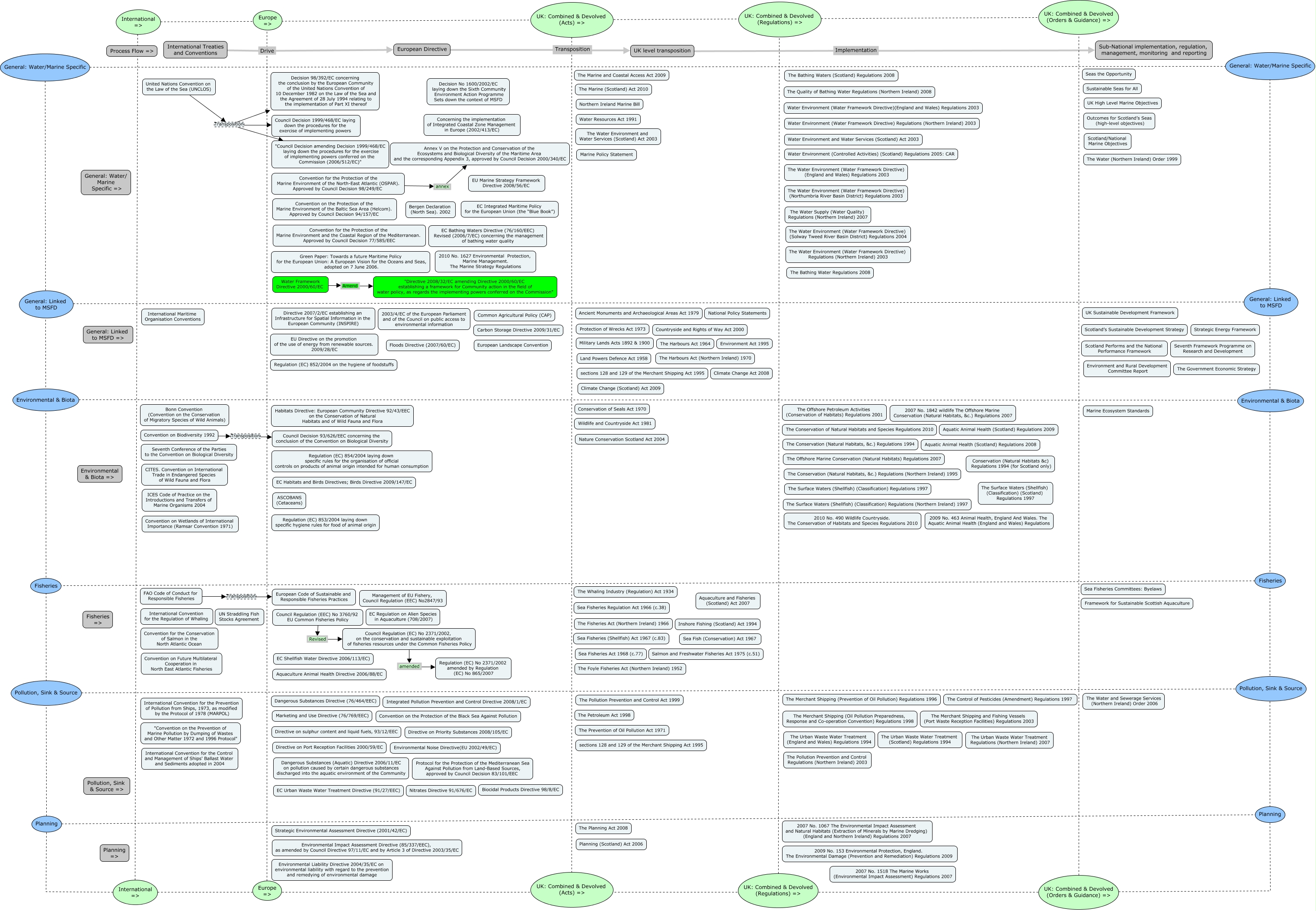 This Concept Map, created with IHMC CmapTools, has information related to: gen3 msfd instrument map, International => UK: Combined & Devolved (Orders & Guidance) =>, Pollution, Sink & Source Pollution, Sink & Source, United Nations Convention on the Law of the Sea (UNCLOS) Transposition Decision 98/392/EC concerning the conclusion by the European Community of the United Nations Convention of 10 December 1982 on the Law of the Sea and the Agreement of 28 July 1994 relating to the implementation of Part XI thereof, FAO Code of Conduct for Responsible Fisheries Transposition European Code of Sustainable and Responsible Fisheries Practices, Planning General: Water/Marine Specific, General: Water/Marine Specific General: Water/Marine Specific, UK: Combined & Devolved (Regulations) => UK: Combined & Devolved (Regulations) =>, UK: Combined & Devolved (Acts) => UK: Combined & Devolved (Acts) =>, UK: Combined & Devolved (Orders & Guidance) => Planning, Convention for the Protection of the Marine Environment of the North-East Atlantic (OSPAR). Approved by Council Decision 98/249/EC annex Annex V on the Protection and Conservation of the Ecosystems and Biological Diversity of the Maritime Area and the corresponding Appendix 3, approved by Council Decision 2000/340/EC, United Nations Convention on the Law of the Sea (UNCLOS) Transposition Council Decision 1999/468/EC laying down the procedures for the exercise of implementing powers, Council Regulation (EC) No 2371/2002, on the conservation and sustainable exploitation of fisheries resources under the Common Fisheries Policy amended Regulation (EC) No 2371/2002 amended by Regulation (EC) No 865/2007, European Directive Transposition UK level transposition, Environmental & Biota Environmental & Biota, Planning Planning, International => UK: Combined & Devolved (Orders & Guidance) =>, United Nations Convention on the Law of the Sea (UNCLOS) Transposition "Council Decision amending Decision 1999/468/EC laying down the procedures for the exercise of implementing powers conferred on the Commission (2006/512/EC)", Convention on Biodiversity 1992 Transposition Council Decision 93/626/EEC concerning the conclusion of the Convention on Biological Diversity, UK level transposition Implementation Sub-National implementation, regulation, management, monitoring and reporting, International Treaties and Conventions Drive European Directive