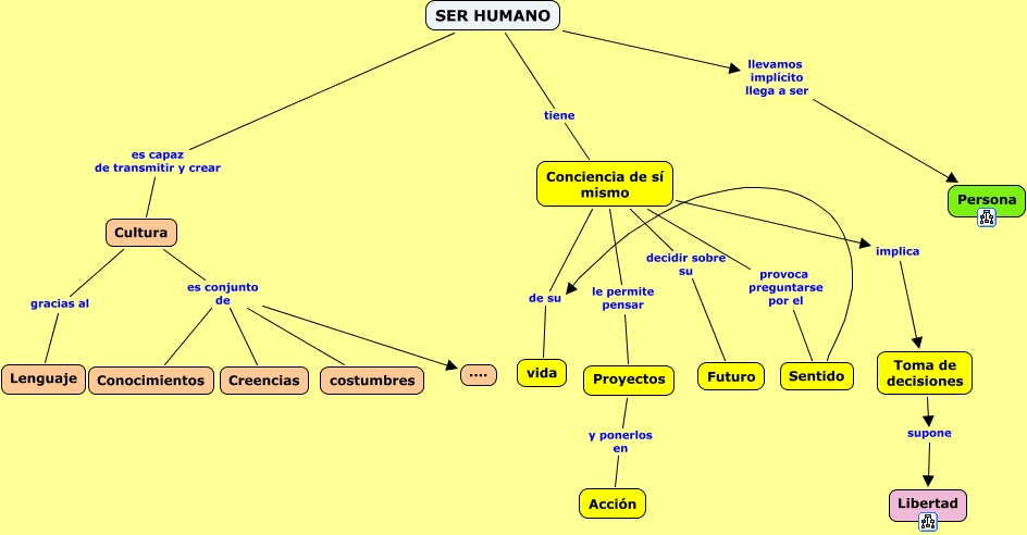 Este Cmap, tiene información relacionada con: SerHumanoEtica, Conciencia de sí mismo implica Toma de decisiones, Conciencia de sí mismo le permite pensar Proyectos, Proyectos y ponerlos en Acción, Conciencia de sí mismo provoca preguntarse por el Sentido, SER HUMANO es capaz de transmitir y crear Cultura, Cultura es conjunto de Creencias, Cultura gracias al Lenguaje, Toma de decisiones supone Libertad, Conciencia de sí mismo de su vida, Sentido de su vida, Cultura es conjunto de costumbres, Cultura es conjunto de Conocimientos, SER HUMANO tiene Conciencia de sí mismo, SER HUMANO llevamos implícito llega a ser Persona, Cultura es conjunto de ...., Conciencia de sí mismo decidir sobre su Futuro