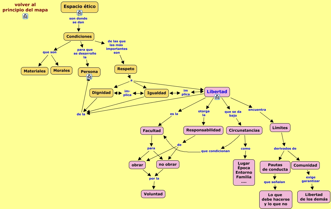 Este Cmap, tiene información relacionada con: EspacioEtico, Respeto a Igualdad, Circunstancias que condicionan Facultad, Libertad encuentra Límites, Circunstancias como Lugar Época Entorno Familia ...., Libertad es la Facultad, Igualdad de la Persona, Comunidad exige garantizar Libertad de los demás, Límites derivados de Comunidad, Respeto a Libertad, Libertad otorga la Responsabilidad, Responsabilidad de obrar, Pautas de conducta que señalan Lo que debe hacerse y lo que no, Igualdad im plica Libertad, Facultad para obrar, Libertad que se da bajo Circunstancias, Dignidad de la Persona, Condiciones que son Materiales, Condiciones para que se desarrolle la Persona, no obrar por la Voluntad, Condiciones que son Morales