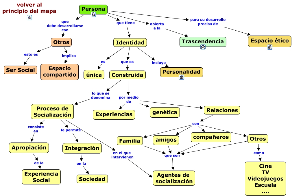 Este Cmap, tiene información relacionada con: Persona, Construida por medio de Relaciones, Relaciones con Familia, Integración en la Sociedad, Apropiación de la Experiencia Social, amigos que son Agentes de socialización, Relaciones con amigos, Relaciones con Otros, Identidad incluye Personalidad, Proceso de Socialización en el que intervienen Agentes de socialización, Persona abierta a la Trascendencia, Relaciones con compañeros, Otros esto es Ser Social, Proceso de Socialización consiste en Apropiación, Proceso de Socialización le permite Integración, Persona que tiene Identidad, Construida por medio de Experiencias, compañeros que son Agentes de socialización, Otros que son Agentes de socialización, Persona que debe desarrollarse con Otros, Construida por medio de genética