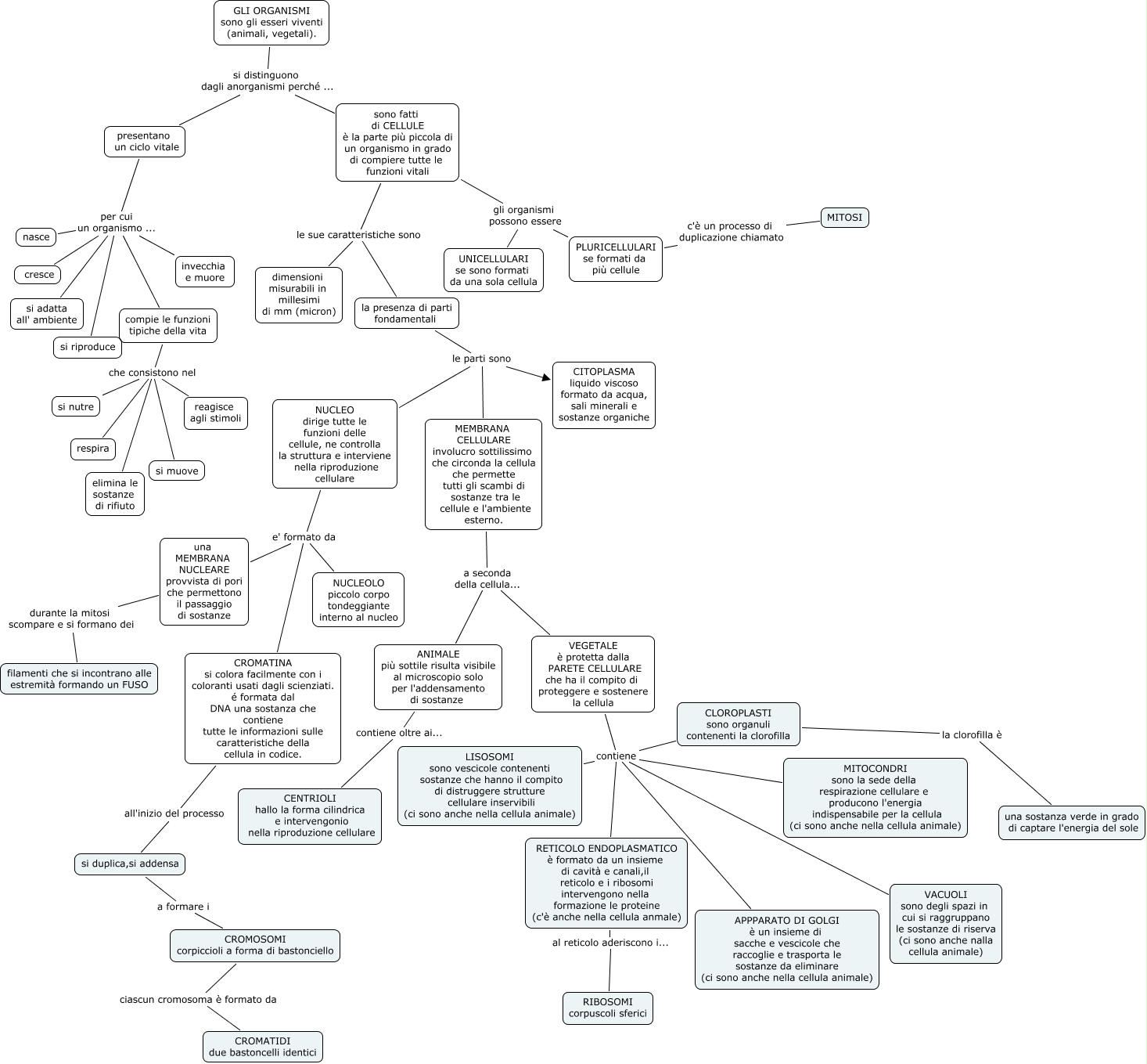 Questa Cmap, creata con IHMC CmapTools, contiene informazioni relative a: che cosa sono i viventi mappa prime 4 pag, NUCLEO dirige tutte le funzioni delle cellule, ne controlla la struttura e interviene nella riproduzione cellulare e' formato da una MEMBRANA NUCLEARE provvista di pori che permettono il passaggio di sostanze, compie le funzioni tipiche della vita che consistono nel reagisce agli stimoli, GLI ORGANISMI sono gli esseri viventi (animali, vegetali). si distinguono dagli anorganismi perché ... presentano un ciclo vitale, GLI ORGANISMI sono gli esseri viventi (animali, vegetali). si distinguono dagli anorganismi perché ... sono fatti di CELLULE è la parte più piccola di un organismo in grado di compiere tutte le funzioni vitali, VEGETALE è protetta dalla PARETE CELLULARE che ha il compito di proteggere e sostenere la cellula contiene RETICOLO ENDOPLASMATICO è formato da un insieme di cavità e canali,il reticolo e i ribosomi intervengono nella formazione le proteine (c'è anche nella cellula anmale), RETICOLO ENDOPLASMATICO è formato da un insieme di cavità e canali,il reticolo e i ribosomi intervengono nella formazione le proteine (c'è anche nella cellula anmale) al reticolo aderiscono i... RIBOSOMI corpuscoli sferici, MEMBRANA CELLULARE involucro sottilissimo che circonda la cellula che permette tutti gli scambi di sostanze tra le cellule e l'ambiente esterno. a seconda della cellula... ANIMALE più sottile risulta visibile al microscopio solo per l'addensamento di sostanze, MEMBRANA CELLULARE involucro sottilissimo che circonda la cellula che permette tutti gli scambi di sostanze tra le cellule e l'ambiente esterno. a seconda della cellula... VEGETALE è protetta dalla PARETE CELLULARE che ha il compito di proteggere e sostenere la cellula, NUCLEO dirige tutte le funzioni delle cellule, ne controlla la struttura e interviene nella riproduzione cellulare e' formato da CROMATINA si colora facilmente con i coloranti usati dagli scienziati. é formata dal DNA una sostanza che contiene tutte le informazioni sulle caratteristiche della cellula in codice., VEGETALE è protetta dalla PARETE CELLULARE che ha il compito di proteggere e sostenere la cellula contiene CLOROPLASTI sono organuli contenenti la clorofilla, CROMATINA si colora facilmente con i coloranti usati dagli scienziati. é formata dal DNA una sostanza che contiene tutte le informazioni sulle caratteristiche della cellula in codice. all'inizio del processo si duplica,si addensa, si duplica,si addensa a formare i CROMOSOMI corpiccioli a forma di bastonciello, PLURICELLULARI se formati da più cellule c'è un processo di duplicazione chiamato MITOSI, compie le funzioni tipiche della vita che consistono nel respira, sono fatti di CELLULE è la parte più piccola di un organismo in grado di compiere tutte le funzioni vitali gli organismi possono essere UNICELLULARI se sono formati da una sola cellula, presentano un ciclo vitale per cui un organismo ... si riproduce, NUCLEO dirige tutte le funzioni delle cellule, ne controlla la struttura e interviene nella riproduzione cellulare e' formato da NUCLEOLO piccolo corpo tondeggiante interno al nucleo, compie le funzioni tipiche della vita che consistono nel si muove, sono fatti di CELLULE è la parte più piccola di un organismo in grado di compiere tutte le funzioni vitali le sue caratteristiche sono la presenza di parti fondamentali, presentano un ciclo vitale per cui un organismo ... compie le funzioni tipiche della vita